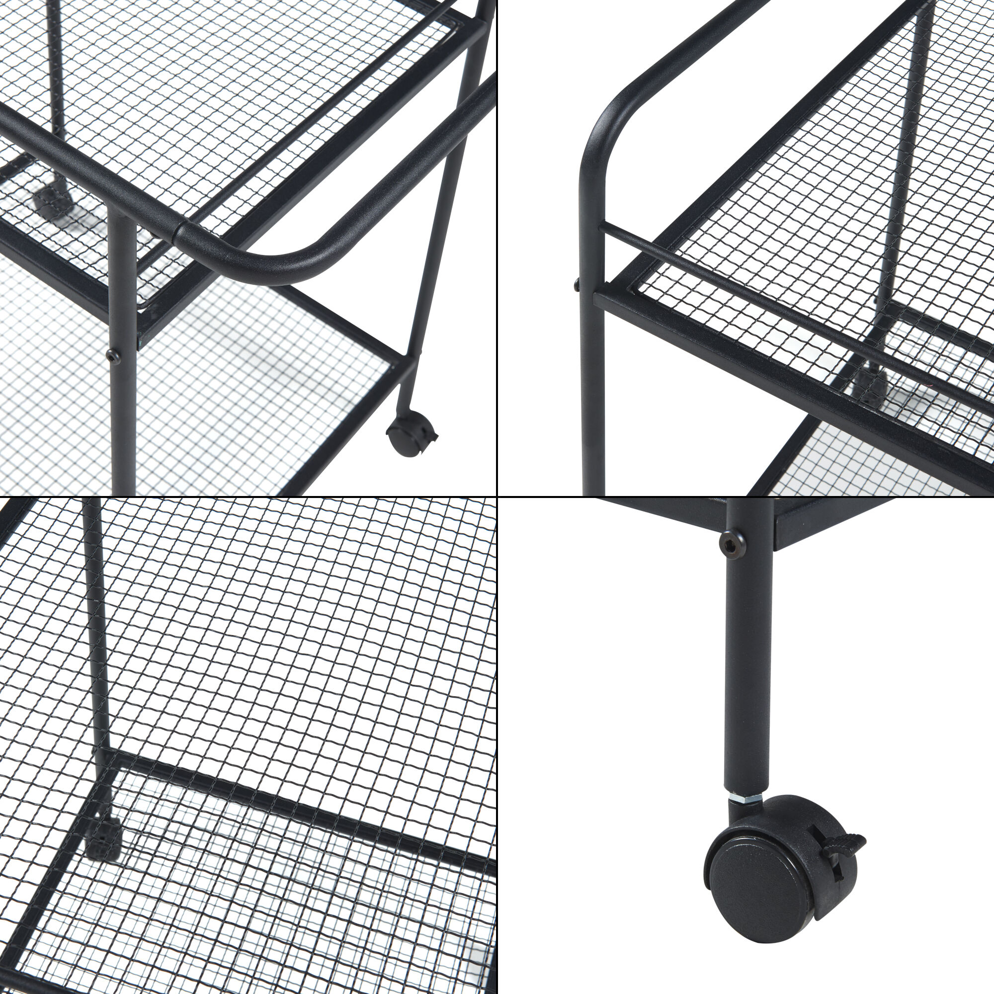 Con dos amplios estantes de rejilla, este carro ofrece la solución perfecta para organizar vajilla, bebidas, aperitivos y otros artículos que desees tener siempre a mano. Durante el traslado, se garantiza la seguridad de los objetos transportados en el estante superior mediante la presencia de asas y barras anticaída.