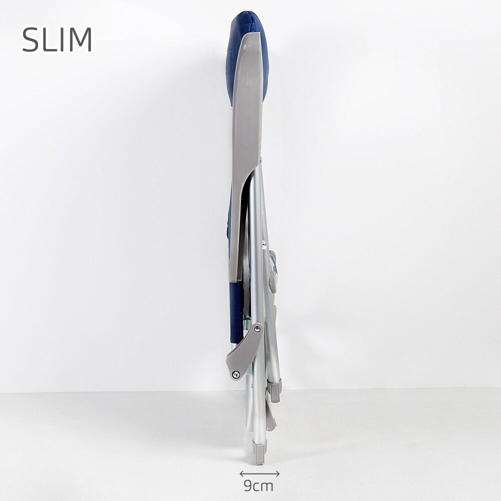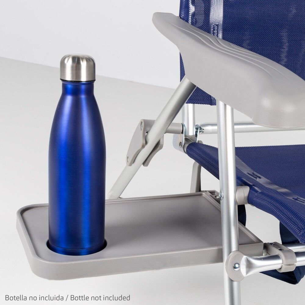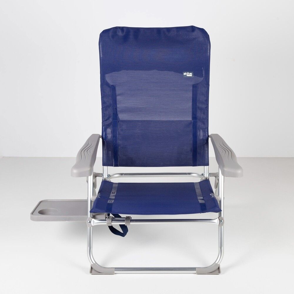 Estas sillas de playa Aktive Beach han sido diseñadas para relajarse durante horas en la playa y ocupar el mínimo espacio cuando están plegadas, ya que su característica principal es el plegado Slim. Están fabricadas con estructura de aluminio plateada (soporta hasta 110 kg), su tejido es textileno reforzado color azul marino y los reposabrazos ergonómicos son de plástico resistente color gris. Las sillas ofrecen gran comodidad y funcionalidad gracias a su cojín acolchado, al respaldo multiposición fácil de regular con los reposabrazos (6 posiciones), a la ausencia de tubo delantero en las piernas y a la mesa extraíble situada debajo del asiento. Las patas llevan incorporados topes antivuelco para más estabilidad y seguridad durante su uso y cuentan con costuras termoselladas en respaldo y asiento para mayor resistencia y durabilidad. Gracias a su plegado extraplano, a su peso ligero y a las asas de mano incorporadas, son muy fácil de transportar, almacenar y apilar.