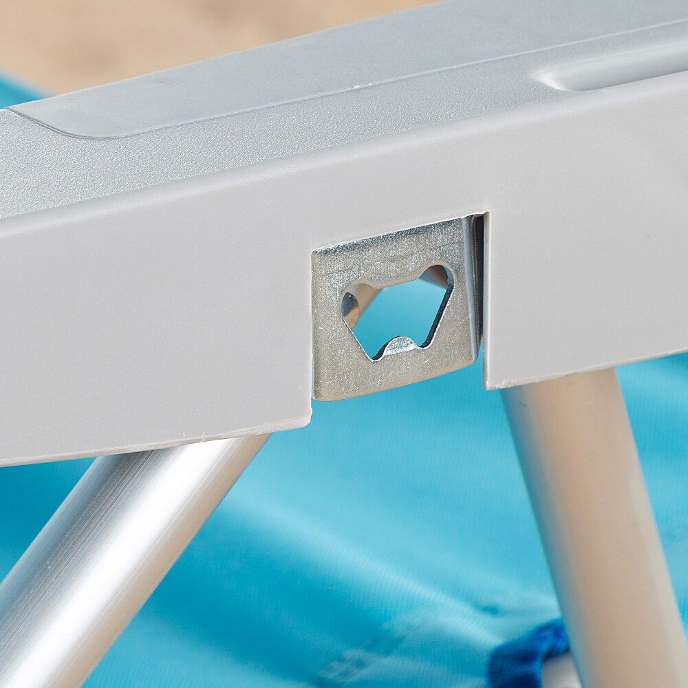 Pack compuesto por dos sillas de playa plegables Aktive. Cada silla está fabricada con estructura de aluminio plateada (soporta hasta 110 kg), tejido de textileno azul y reposabrazos ergonómicos de plástico resistente color gris. Ofrecen gran comodidad gracias a su cojín acolchado, al respaldo multiposición reclinable hasta en 5 posiciones (incluyendo posición horizontal gracias a su soporte de aluminio trasero), a la ausencia de barra frontal en las piernas y a sus topes antivuelco en las patas, que ofrecen estabilidad incluso en superficies arenosas. Incluyen bolsito lateral extraíble con cremallera para guardar de forma segura pertenencias, un abridor de bebidas y reposabrazos con soportes para móvil y posavasos. Para facilitar su transporte, tienen asas de mochila y cierre de clic que garantiza que se mantengan cerradas y no se abran durante el trayecto.
