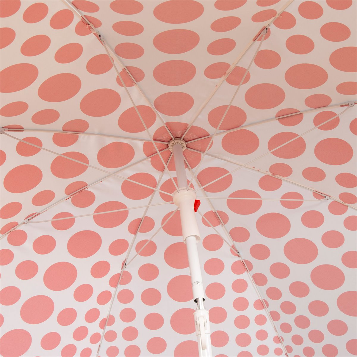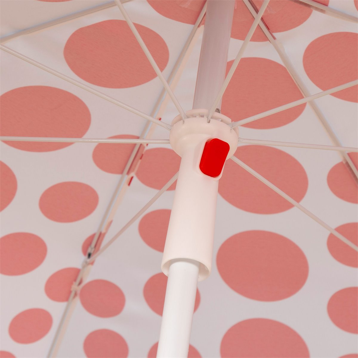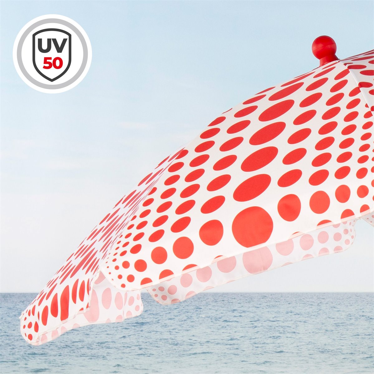 Disfruta de un verano lleno de comodidad y estilo con esta sombrilla de playa de 200 cm de diámetro. Su diseño con un alegre estampado de lunares rojos la convierte en un complemento ideal para relajarte en la playa o en el jardín. Fabricada con un resistente mástil de acero y 8 varillas reforzadas, ofrece estabilidad y durabilidad. Su tejido de poliéster cuenta con protección UV50, bloqueando los rayos solares y reduciendo el calor bajo la sombrilla para mayor confort. Además, su mástil inclinable permite ajustar la sombra a lo largo del día, mientras que su altura regulable hasta 200 cm se adapta a diferentes necesidades. Su diseño, ligero y desmontable, con funda incluida, facilita su almacenamiento y transporte. Ideal para disfrutar de días soleados con la mejor protección.