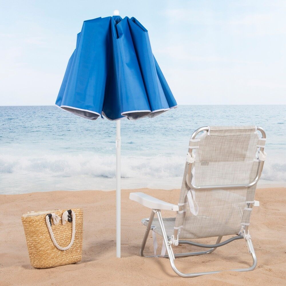 - Ajustable y reclinable: sombrilla playa con mástil regulable en altura (145-200 cm) y reclinable para orientar la sombrilla según la posición del sol