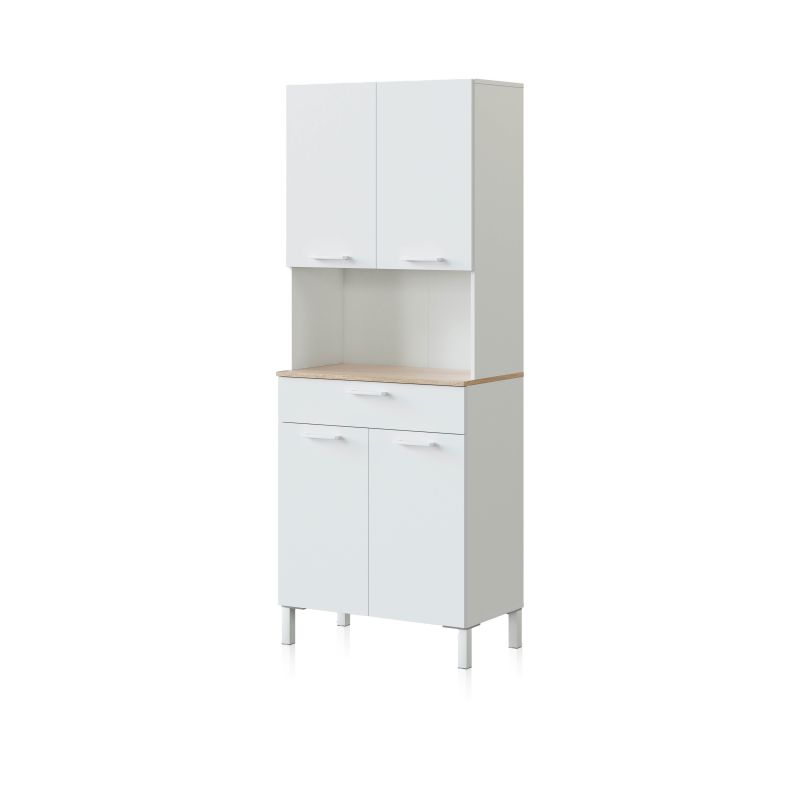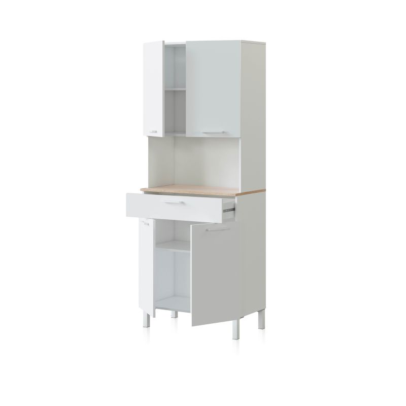 Este mueble está diseñado para optimizar el almacenamiento de utensilios, vajilla y alimentos, contando con cuatro puertas y un cajón central que permiten organizar cada elemento de forma eficiente. La parte superior dispone de dos compartimentos cerrados con estantes internos, ideales para guardar loza o productos de despensa de uso frecuente. En la parte inferior, dos puertas más brindan espacio adicional para almacenar ollas, sartenes o pequeños electrodomésticos.