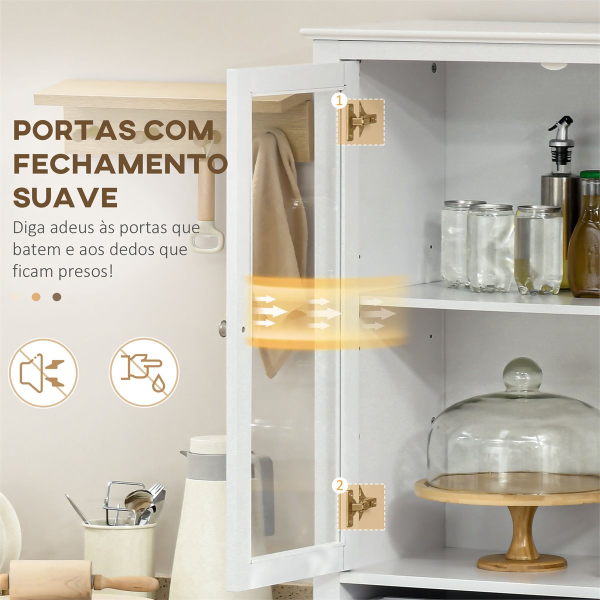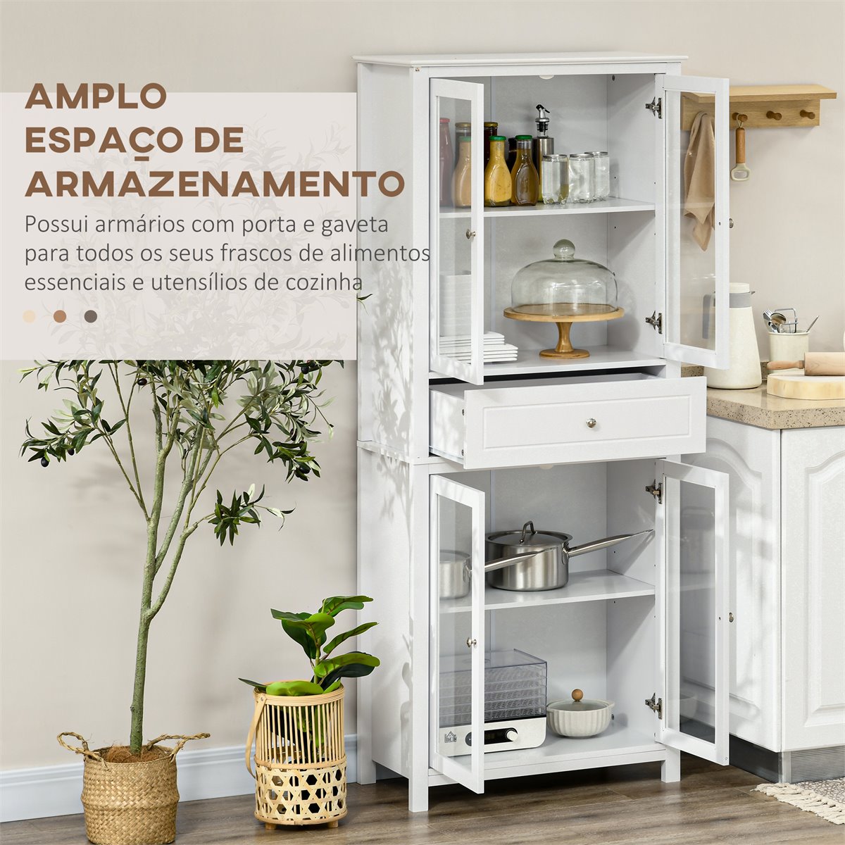 ¿Te encanta estar en la cocina, pero te estás quedando sin espacio? ¿Quieres que tus libros, fotos o decoraciones luzcan siempre bien? Entonces este mueble auxiliar de cocina de HOMCOM es ideal. Su diseño clásico y a la vez moderno hace que se pueda colocar en múltiples espacios de tu hogar, como en la cocina, la sala de estar, estudio u oficina. Consta de 2 armarios con 2 compartimentos cada uno y puertas de cristal, y un cajón en el medio.