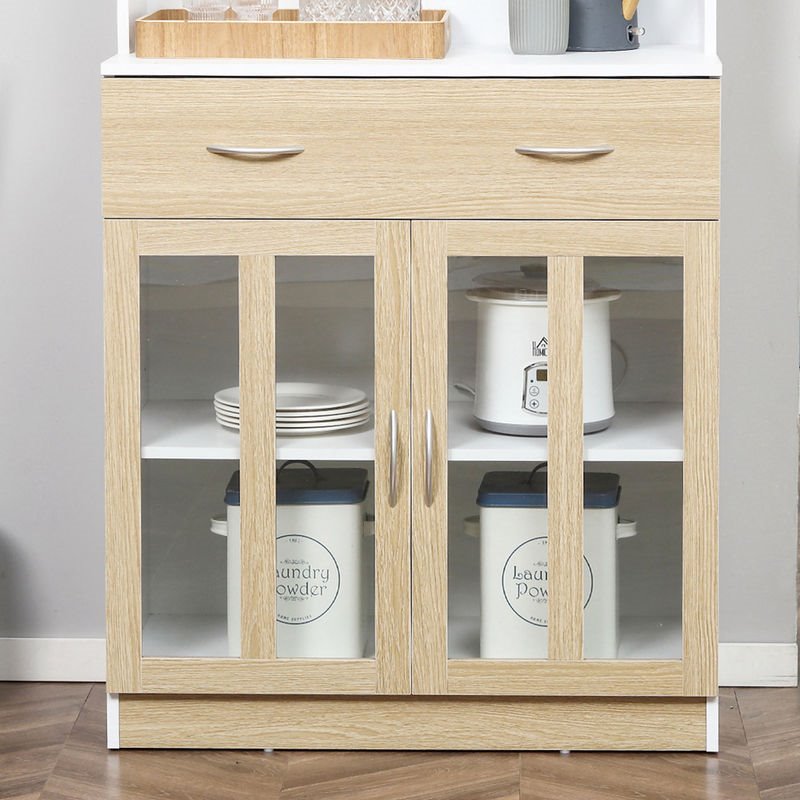 Aprovecha al máximo el espacio de tu cocina con esta elegante alacena de HOMCOM. Fabricado en melamina resistente, incluye armarios superior e inferior, un estante central y un cajón, para guardar electrodomésticos, vajilla y otros objetos. El diseño blanco con detalles en madera combina con cualquier ambiente, aportando un toque moderno.