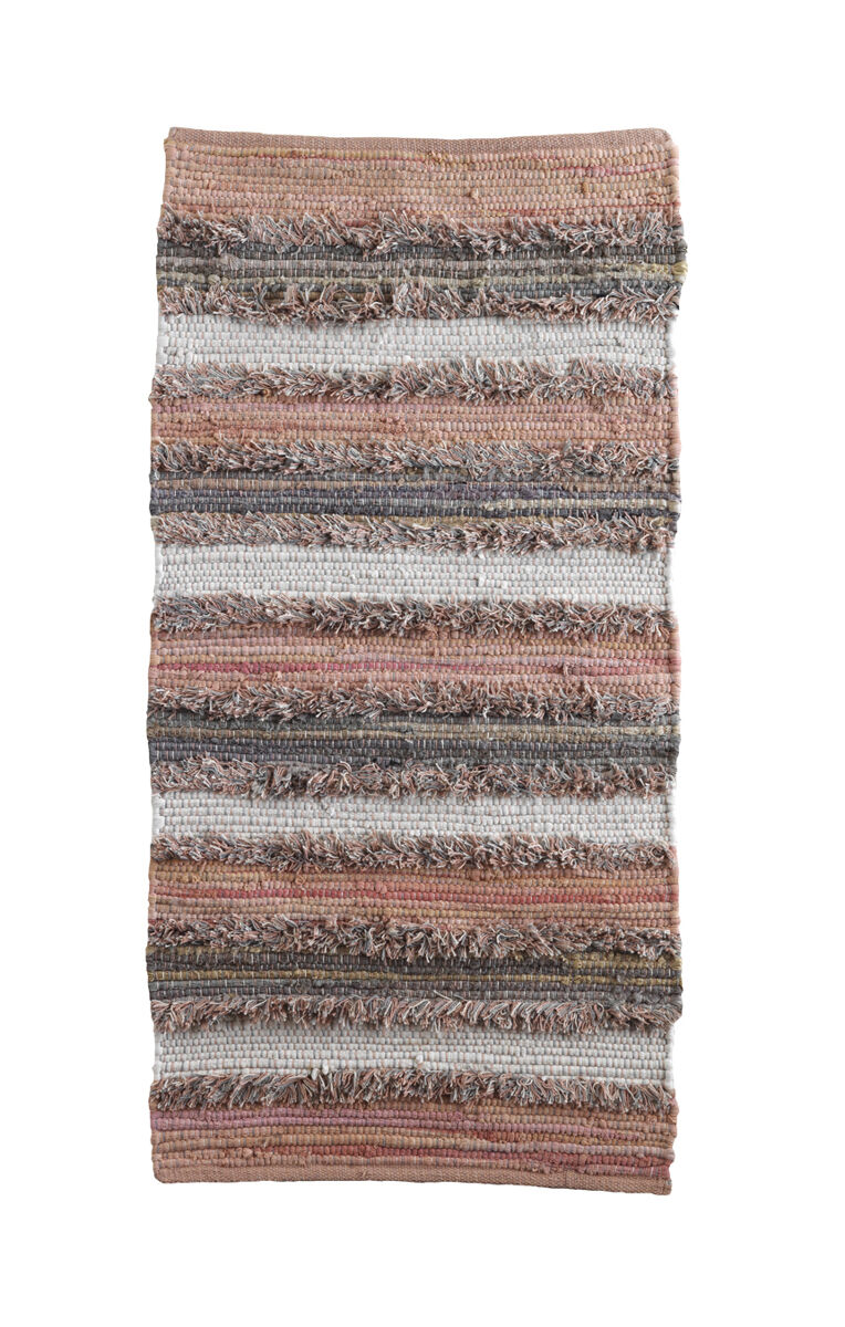 Alfombra confeccionada en tejido de poliéster y algodón con un estampado de rayas combinadas en tonos rosas, crudos y grises. Es un diseño original, atractivo y muy versátil, ideal para colocar en cualquier estancia interior.
