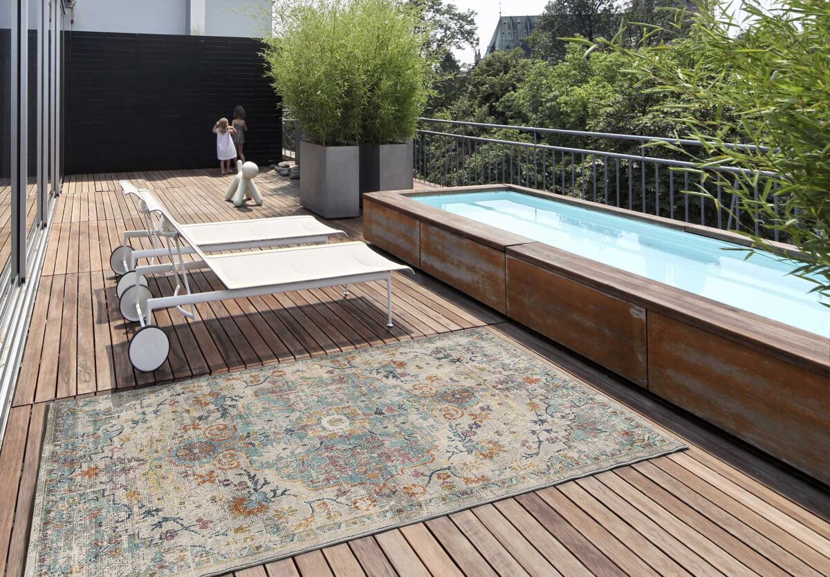 La colección de alfombras de exterior-interior LUNA está compuesta por diferentes diseños de estilo vintage. Alfombras multicolor para darle un toque elegante a tu exterior, pero también perfectas como alfombras de salón. Resistentes al sol y al agua.