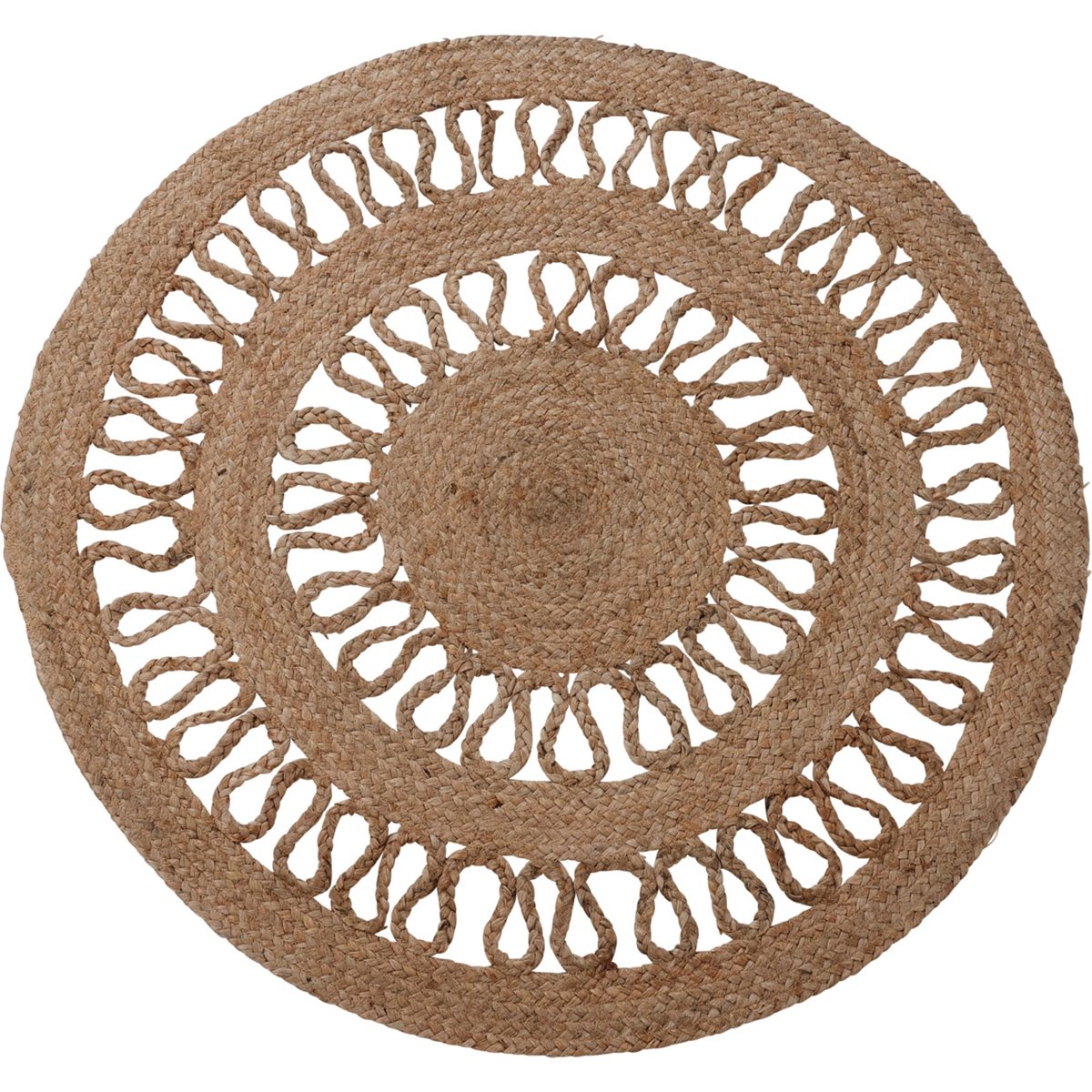 Alfombra redonda de yute trenzado con diseño de 2 líneas caladas. Tiene un diámetro de 90cm, ideal para decorar espacios pequeños o como elemento central en una habitación. El material de yute le da un toque rústico y natural a cualquier ambiente. Perfecta para crear un estilo bohemio y acogedor en tu hogar.