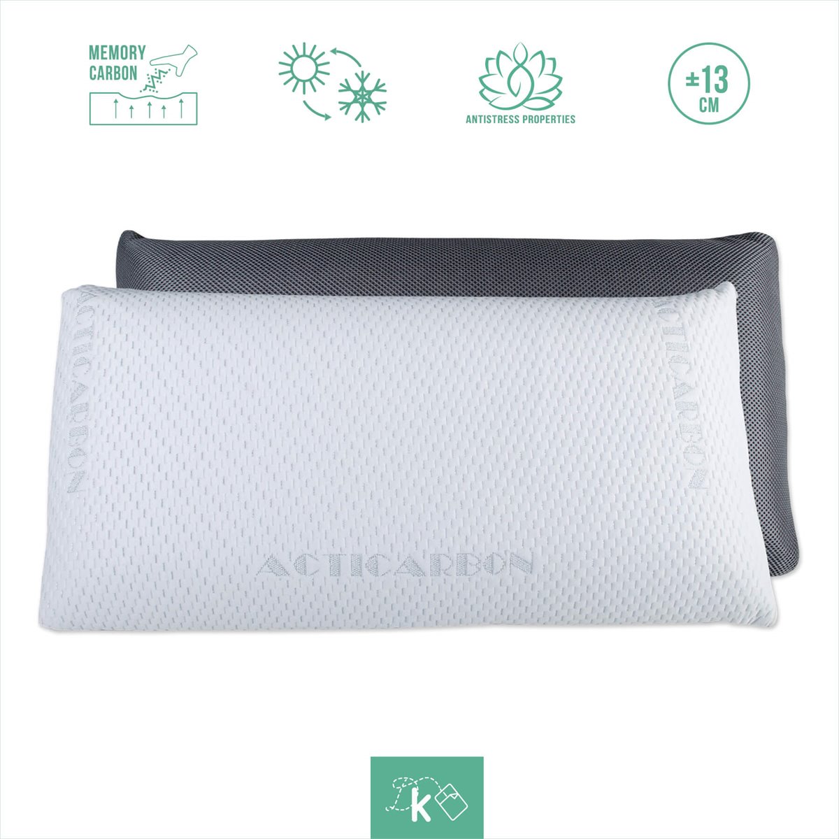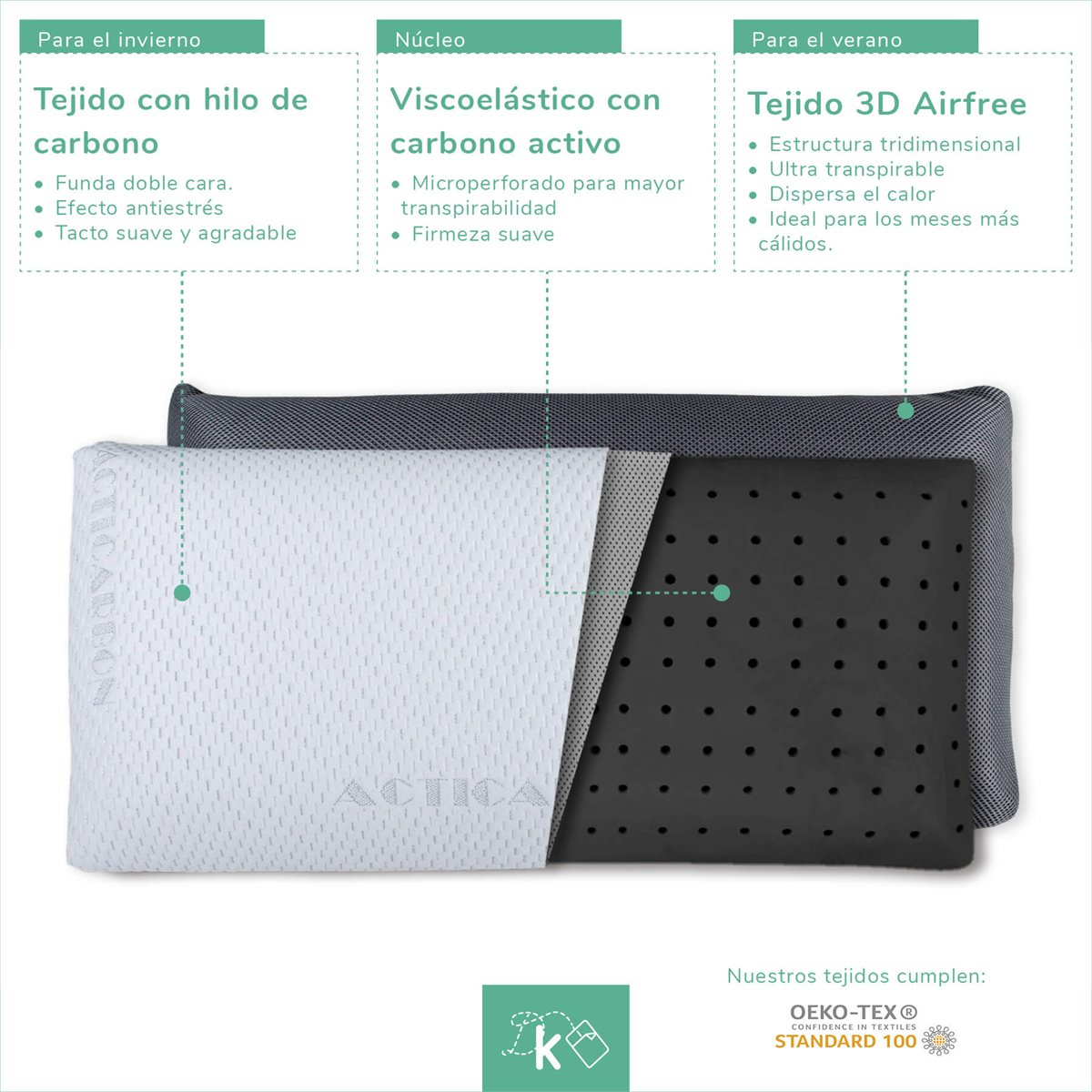 Almohada de 70 cm con núcleo viscoelástico indeformable y carbono activo antiestrés. Está fabricada con materiales de alta calidad, incluyendo un tejido 3D Airfresh ultra transpirable que libera el calor. La almohada tiene una funda interior que protege el núcleo y aporta higiene. Su firmeza es media suave y la altura aproximada es de 12 cm con un ancho de 35 cm. La funda exterior es lavable y presenta un diseño de doble cara: en invierno, el tejido Stretch con hilo de plata absorbe la humedad y proporciona un efecto antibacteriano natural, mientras que en verano, el tejido 3D Airfresh es altamente transpirable, evita la sudoración y libera el calor. La funda es desenfundable con cremallera para facilitar su limpieza. La almohada también destaca por su núcleo viscoelástico con carbono activo, que elimina la electricidad estática y ofrece un efecto antiestrés, mejorando la calidad del descanso.