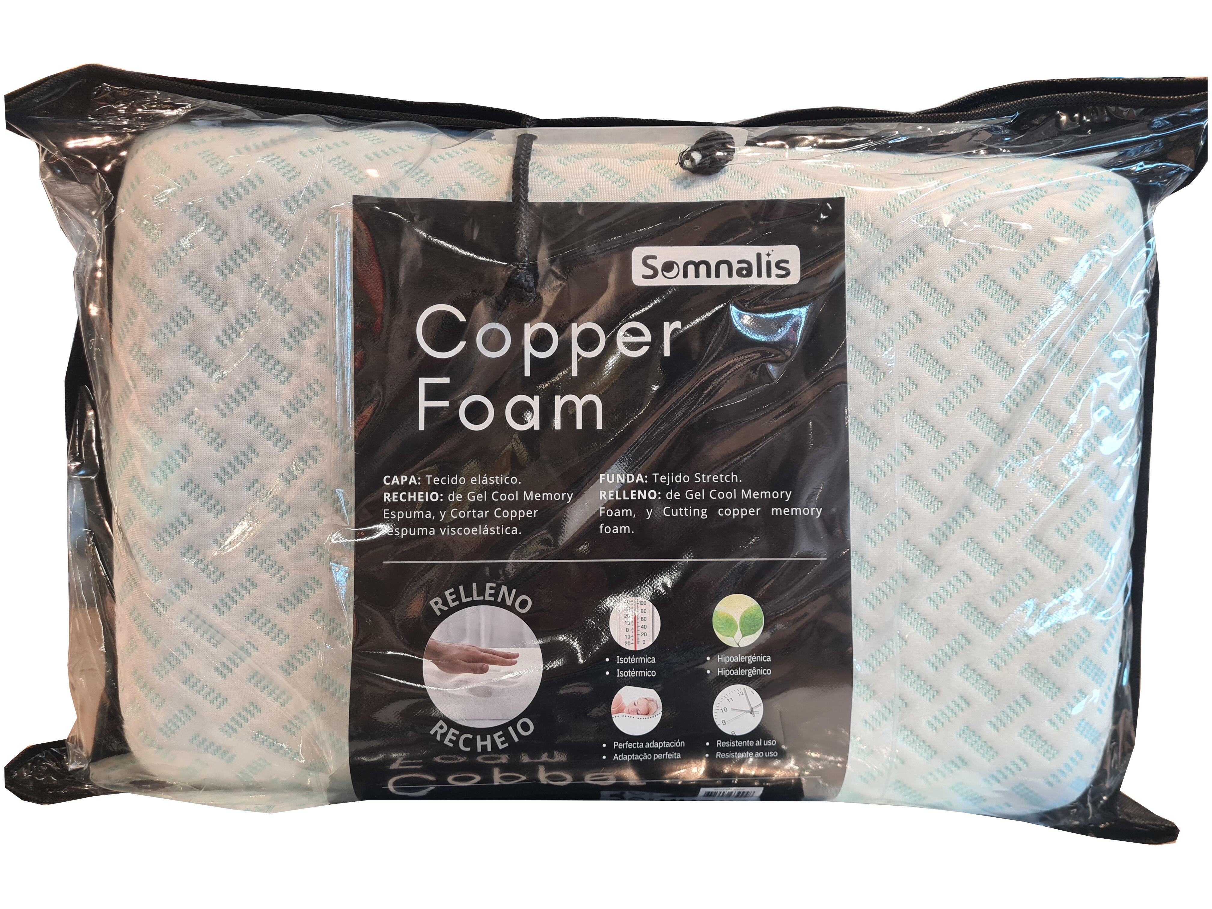 Copper Foam con tejido Stretch y relleno de Gel Cool Memory Foam y Cutting copper memory foam. Es isotermica, hipoalergenica, resistente al uso y se adapta perfectamente al usuario.