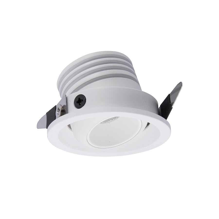 Empotrable basculante led modelo NEPTUNO realizado en aluminio, acabado blanco. De medidas 5 cm de diametro y 3 cm de fondo (medida de corte 42 mm. ). Este empotrable es basculante 30º maximo, para poder focalizar la iluminacion donde mas nos interese.