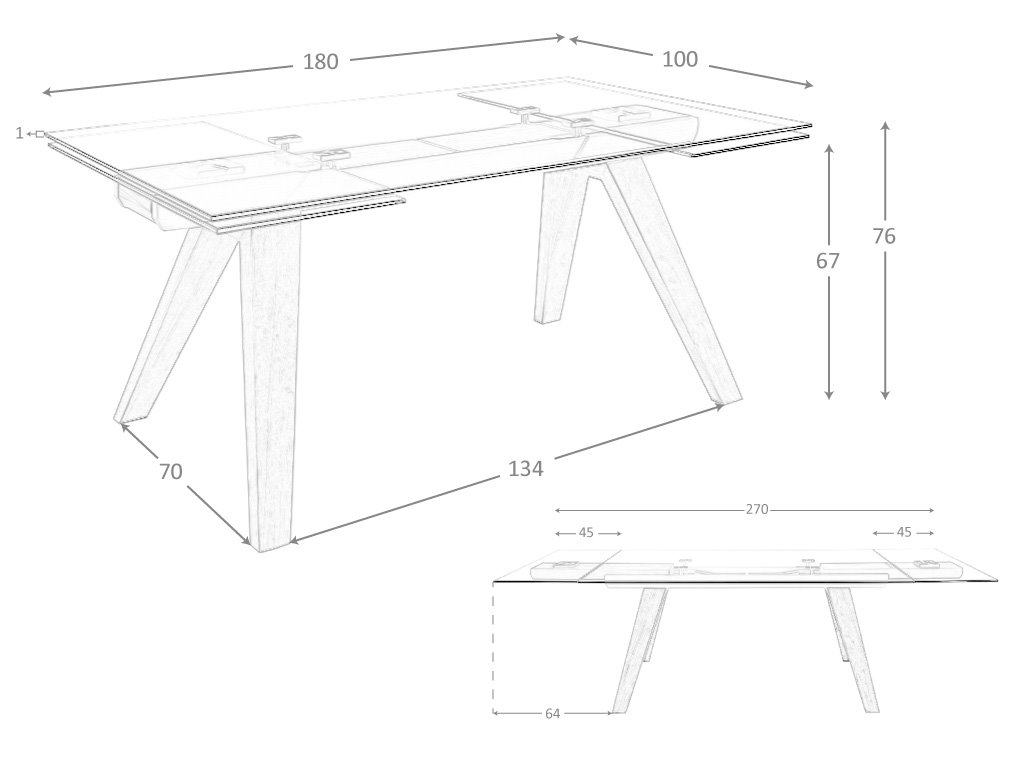 Esta mesa comedor cuenta con 2 extensibles de 45 cm., pudiendo ampliarla de 180 a 270 cm.