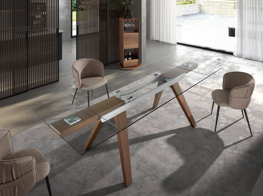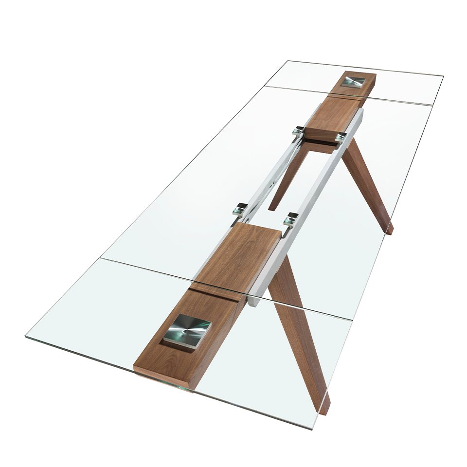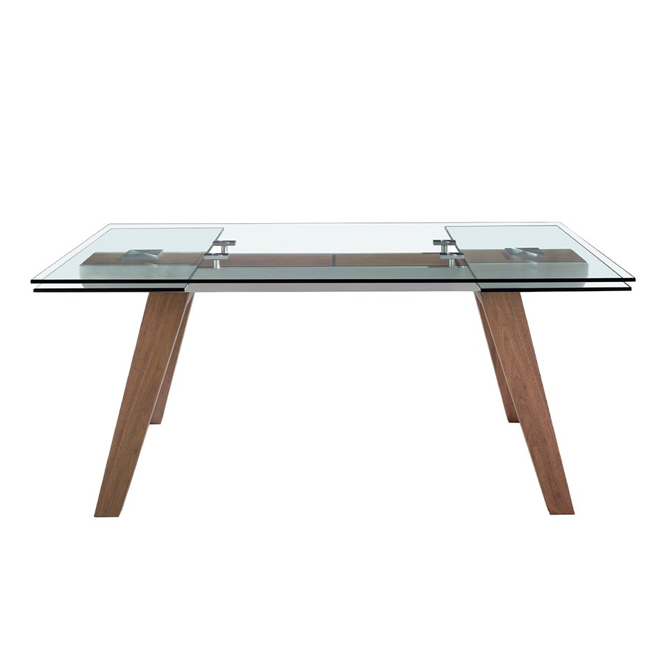 Mesa comedor extensible rectangular de diseño moderno con tapa de cristal templado. Sus patas de madera chapada en nogal natural así como su adaptabilidad, la convierten en un mueble totalmente funcional y versátil para el día a día.