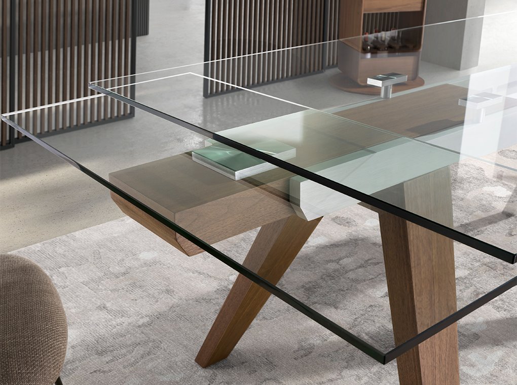 Mesa comedor extensible rectangular cristal templado y nogal modelo 1131 Angel Cerdá S.L.