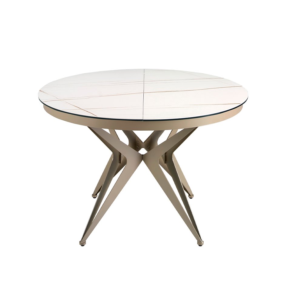 Mesa comedor extensible redonda de diseño moderno con tapa de mármol porcelánico color blanco con vetas marrones en acabado mate. Sus patas de acero inoxidable color gris así como su adaptabilidad, la convierten en un mueble totalmente funcional y versátil para el día a día.