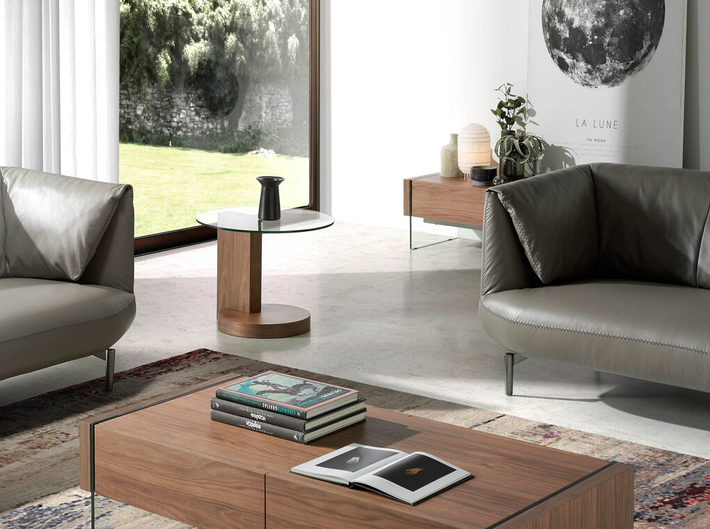 Mesa rincón redonda de diseño moderno con tapa de cristal templado y unas originales patas de madera chapada en nogal natural. Una pieza con un diseño sencillo a la vez que original, con la que aportará un toque único y personal.