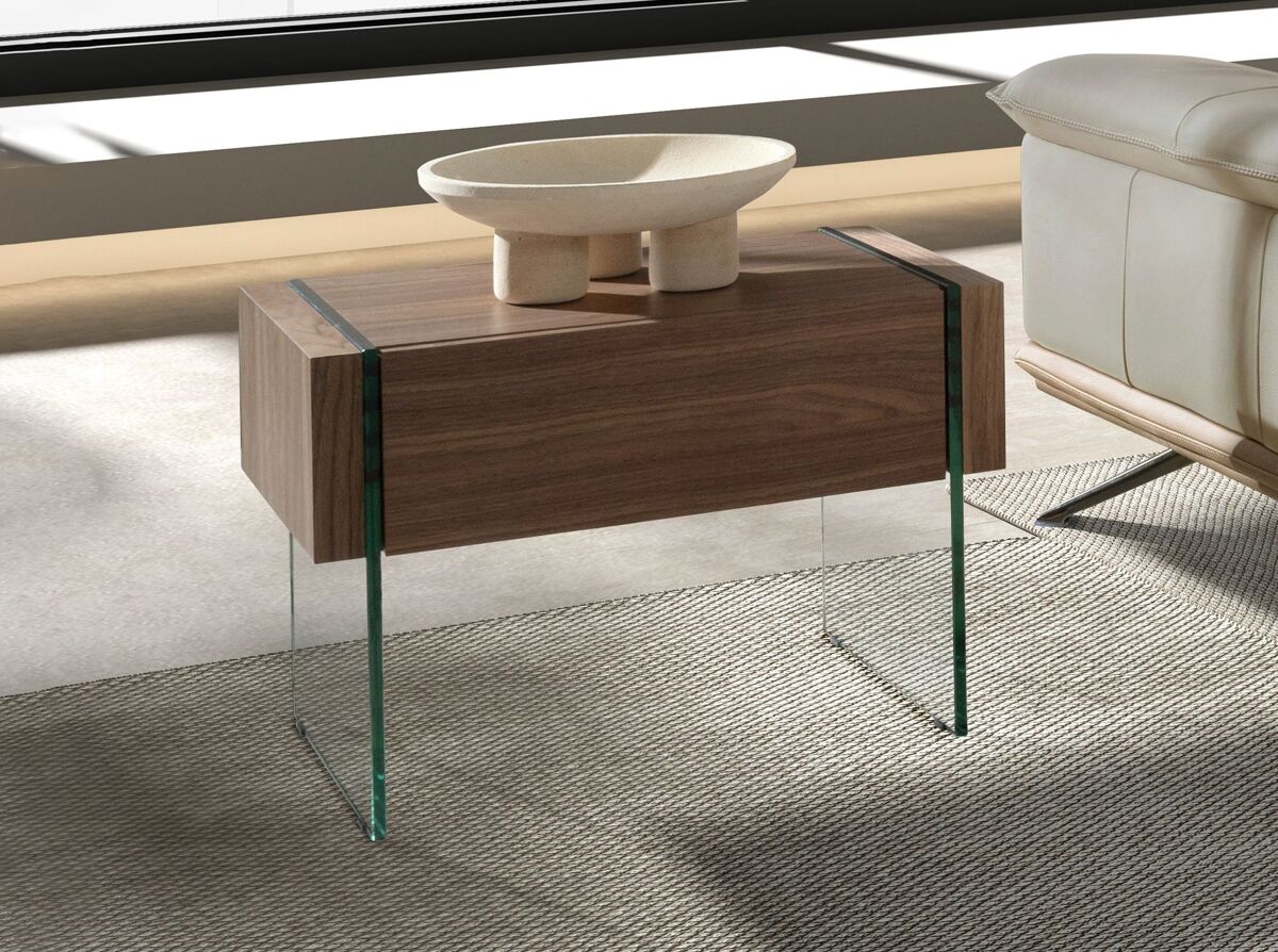 Mesita de noche de diseño moderno con estructura de madera chapada en nogal natural y unas originales patas de cristal templado.