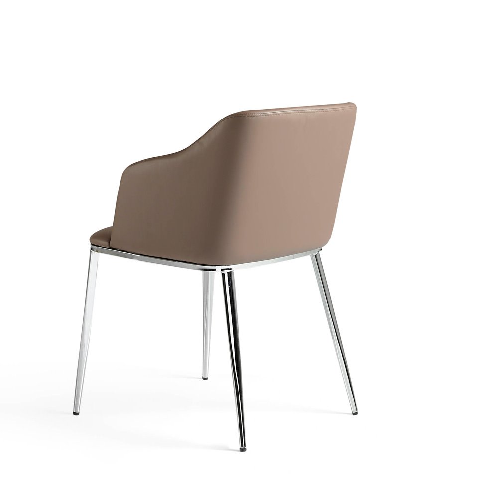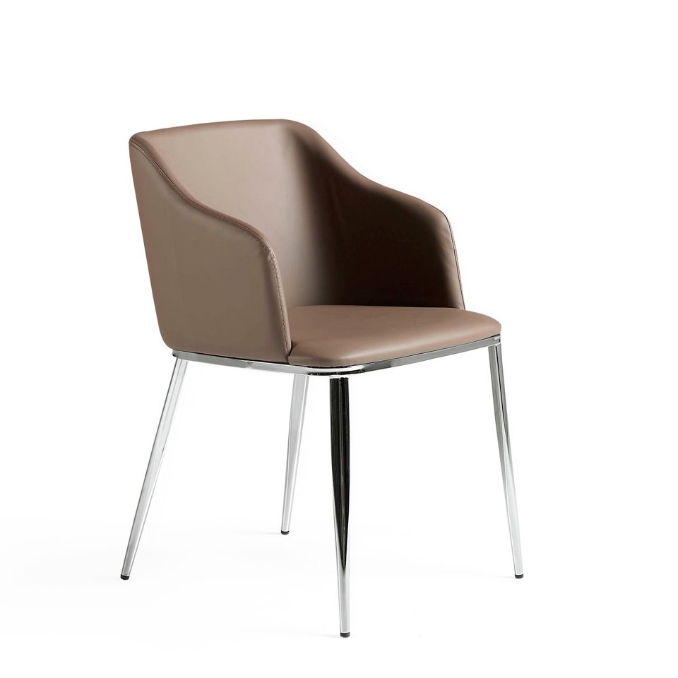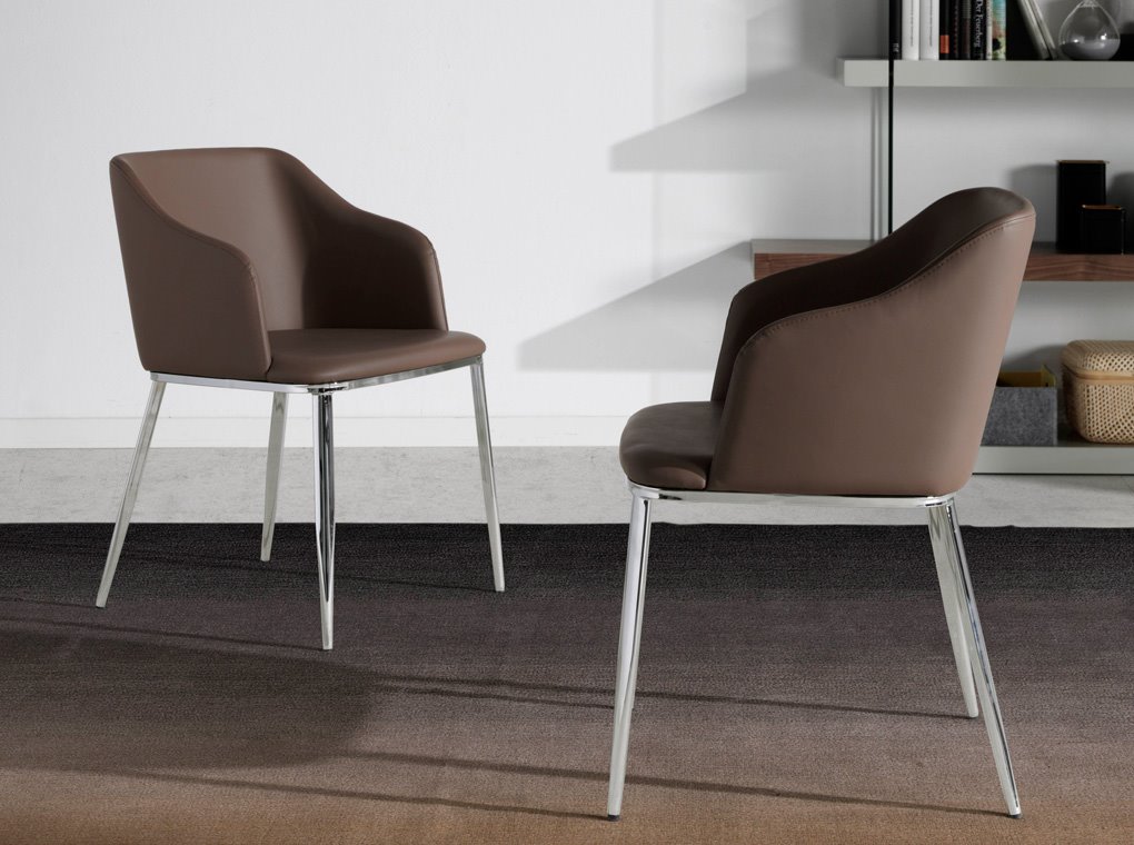 Silla con reposabrazos de diseño moderno con asiento y respaldo tapizados en polipiel color marrón. Sus patas de acero inoxidable cromado de estilo vanguardista a la vez que atemporal, la convertirán en el must have de su cocina o comedor. Esta silla de la firma Angel Cerdá, aúna el estilo único y personal de la marca, así como la mayor comodidad y estabilidad, gracias a la alta calidad de su tapizado y la original estructura de patas.