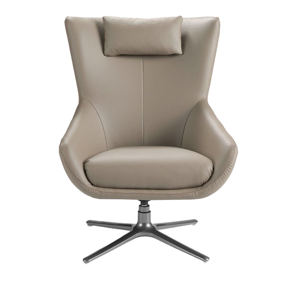 Sillón giratorio con reposabrazos de diseño moderno con asiento y respaldo tapizados en piel de origen vacuno color gris taupe. Tanto por su estilo, como por sus patas de acero inoxidable oscurecido, este sillón es la combinación perfecta entre diseño y confort.