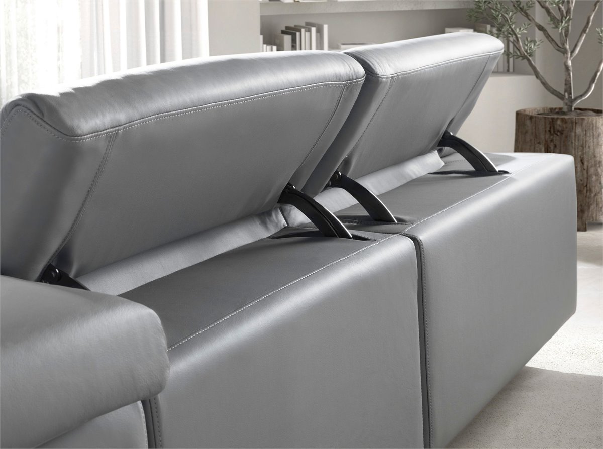 Sofá chaise longue relax derecha de 5 plazas de diseño moderno tapizado en piel de origen vacuno color gris con reposacabezas para garantizar una mayor comodidad. Tanto por su estilo, como por sus patas de acero inoxidable pulido oscurecido, este sofá aportará el toque de vanguardia y elegancia que busca para su hogar.Su sistema de relax eléctrico, le aporta el extra de comodidad que necesita para relajarse.