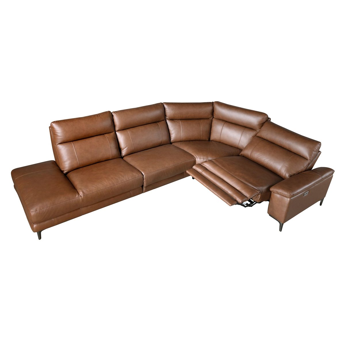 Sofá chaise longue relax izquierda de 5 plazas de diseño moderno tapizado en piel de origen vacuno color marrón tabaco. Tanto por su estilo, como por sus patas de acero inoxidable cromado oscuro, este sofá aportará el toque de vanguardia y elegancia que busca para su hogar.Su sistema de relax eléctrico, le aporta el extra de comodidad que necesita para relajarse.