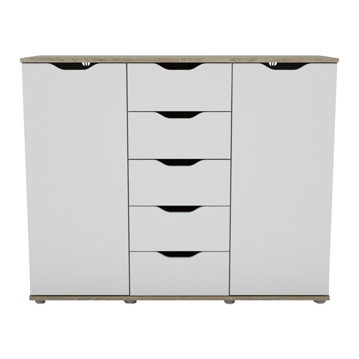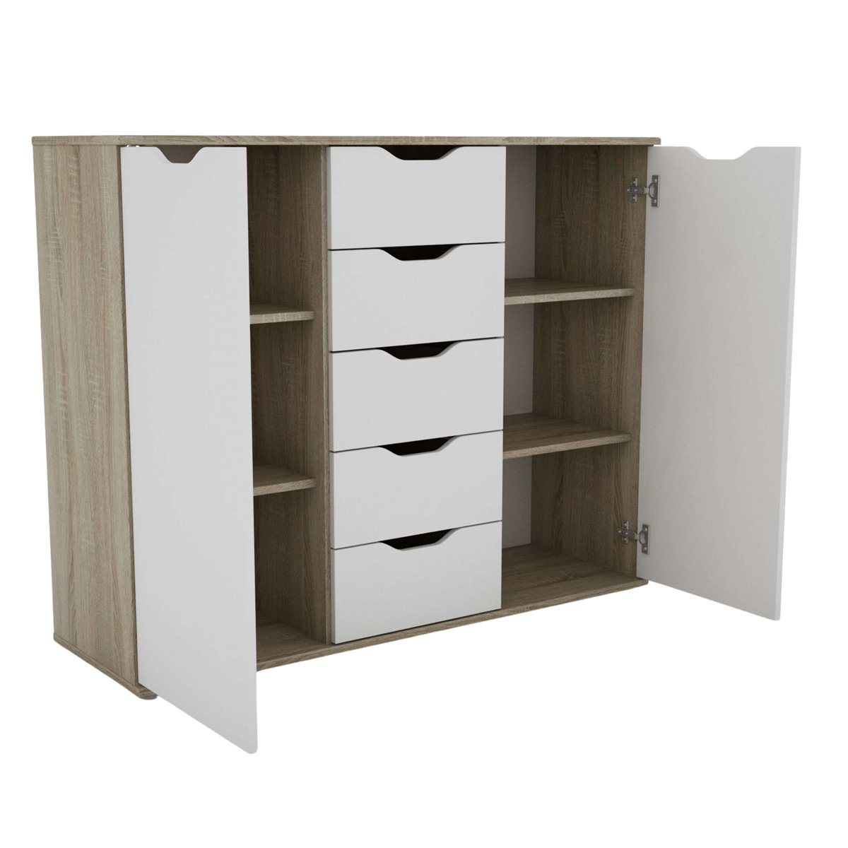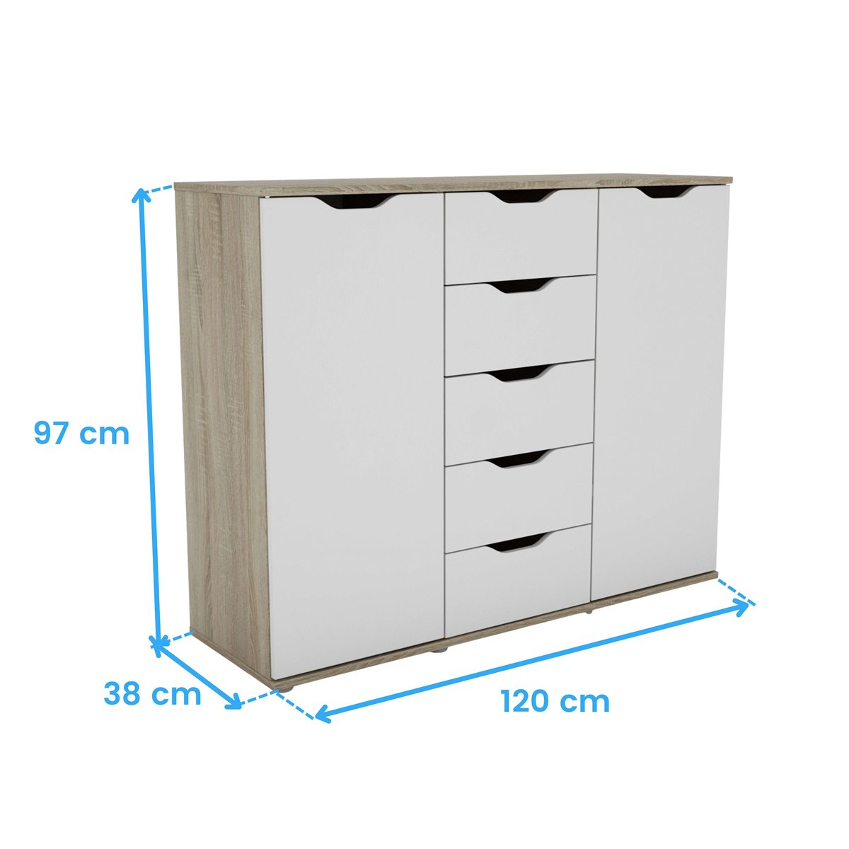 El Aparador Salón Parc 2P 5C en Roble Sonoma y Blanco Mate transforma la sala de estar con sus tonos claros y líneas modernas, impactando visualmente al aportar un aire contemporáneo y acogedor. Su combinación de madera clara y blanco se integra de manera natural en cualquier decoración, resaltando decoraciones y aportando frescura. Perfecto para quienes buscan un espacio moderno y bien equilibrado. Fabricado en melamina, un material ideal para muebles. El Aparador Salón Parc 2P 5C cuenta con 5 cajones, 2 puertas abatibles y 4 estantes, proporcionando un amplio espacio de almacenamiento. Incluye tiradores fresados y guías metálicas que facilitan movimientos suaves. Mejora la eficiencia de tu espacio con este mueble técnico y versátil. ¡Añádelo al carrito hoy! Medidas: Medidas: Ancho: 120 cm, Alto: 97 cm, Profundidad: 38 cm. Se trata de mobiliario con kit de montaje, que incluye manual de instrucciones y tornillería.