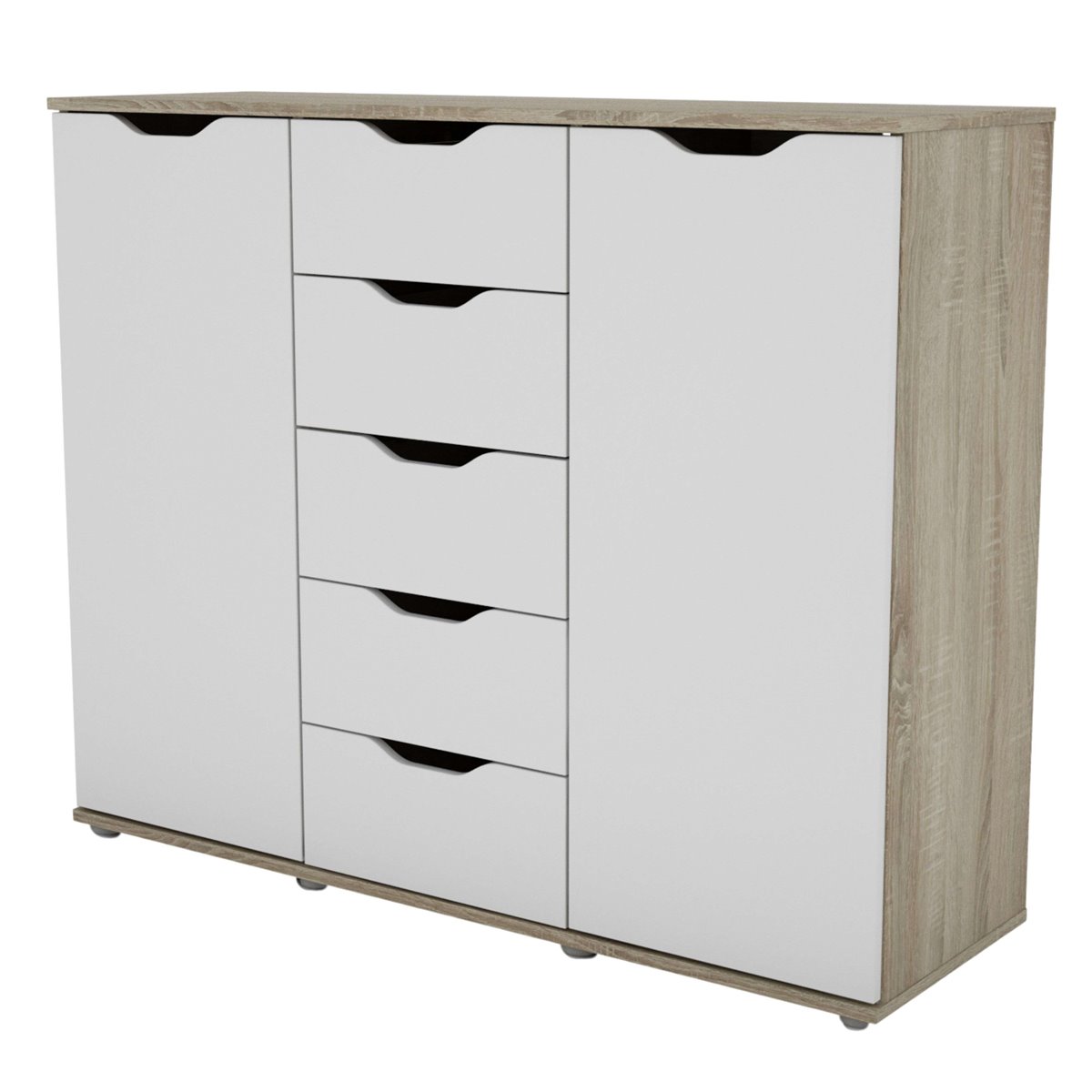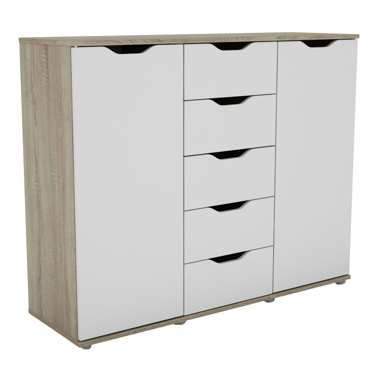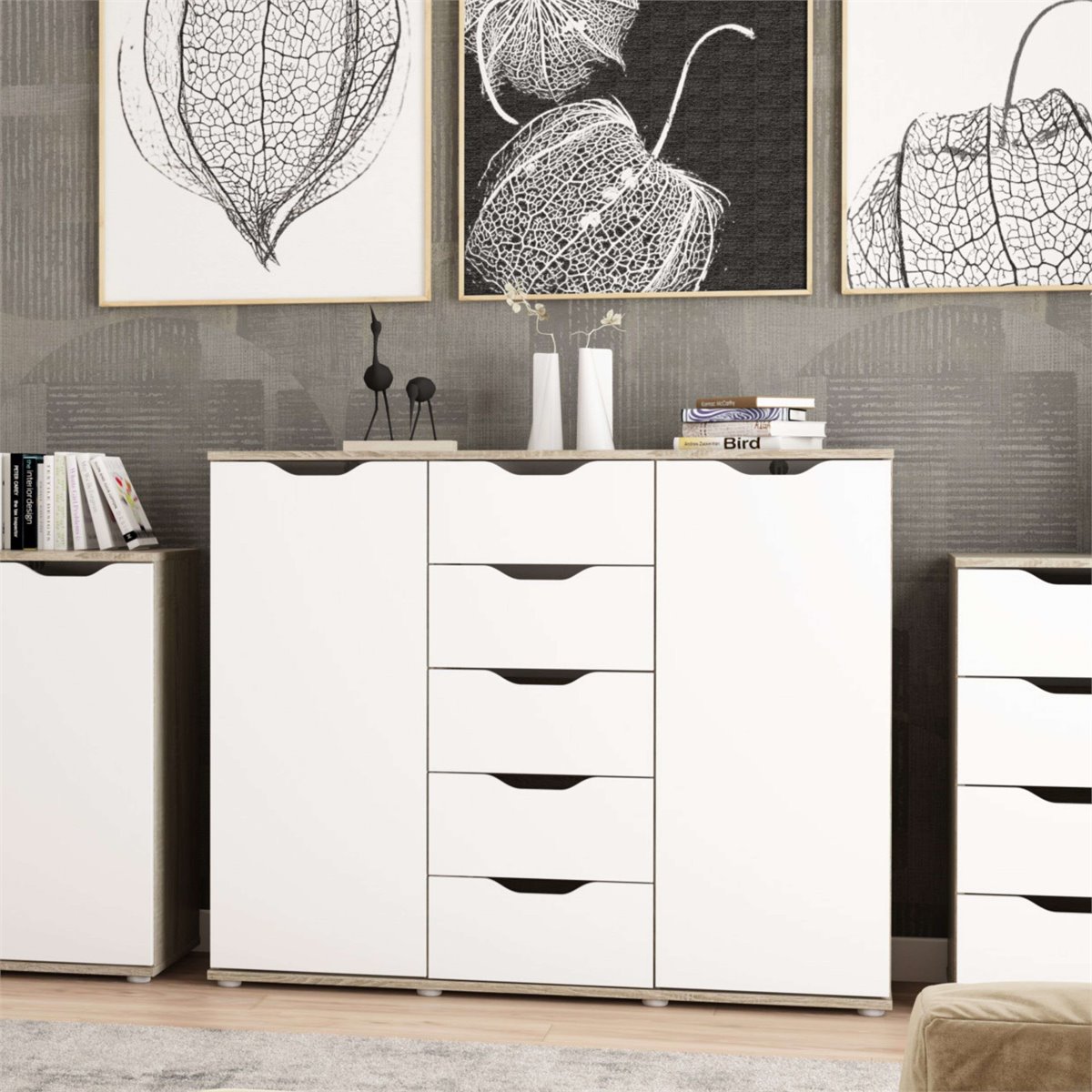 El Aparador Salón Parc 2P 5C en Roble Sonoma y Blanco Mate transforma la sala de estar con sus tonos claros y líneas modernas, impactando visualmente al aportar un aire contemporáneo y acogedor. Su combinación de madera clara y blanco se integra de manera natural en cualquier decoración, resaltando decoraciones y aportando frescura. Perfecto para quienes buscan un espacio moderno y bien equilibrado. Fabricado en melamina, un material ideal para muebles. El Aparador Salón Parc 2P 5C cuenta con 5 cajones, 2 puertas abatibles y 4 estantes, proporcionando un amplio espacio de almacenamiento. Incluye tiradores fresados y guías metálicas que facilitan movimientos suaves. Mejora la eficiencia de tu espacio con este mueble técnico y versátil. ¡Añádelo al carrito hoy! Medidas: Medidas: Ancho: 120 cm, Alto: 97 cm, Profundidad: 38 cm. Se trata de mobiliario con kit de montaje, que incluye manual de instrucciones y tornillería.