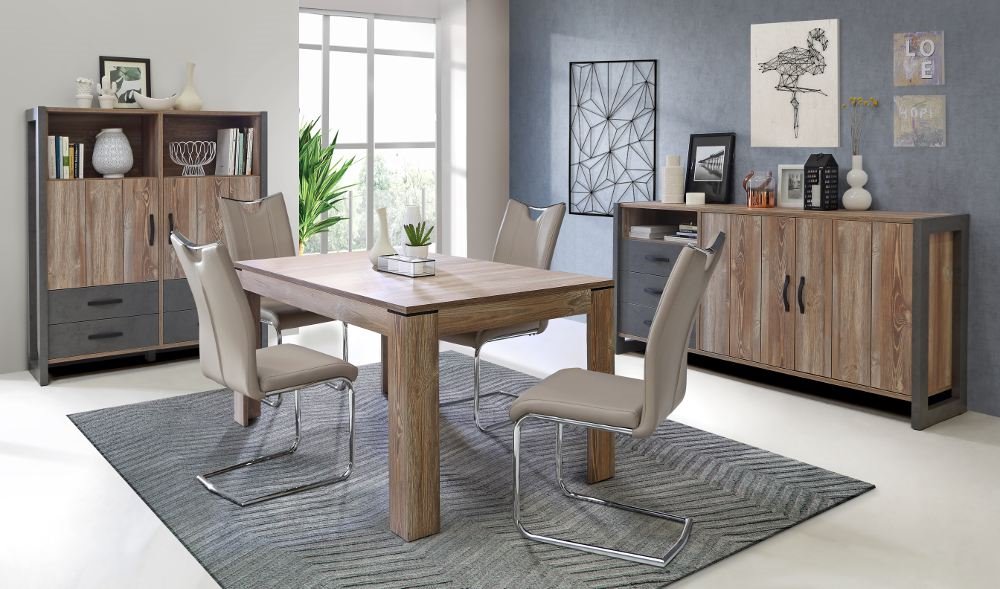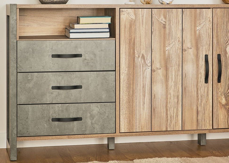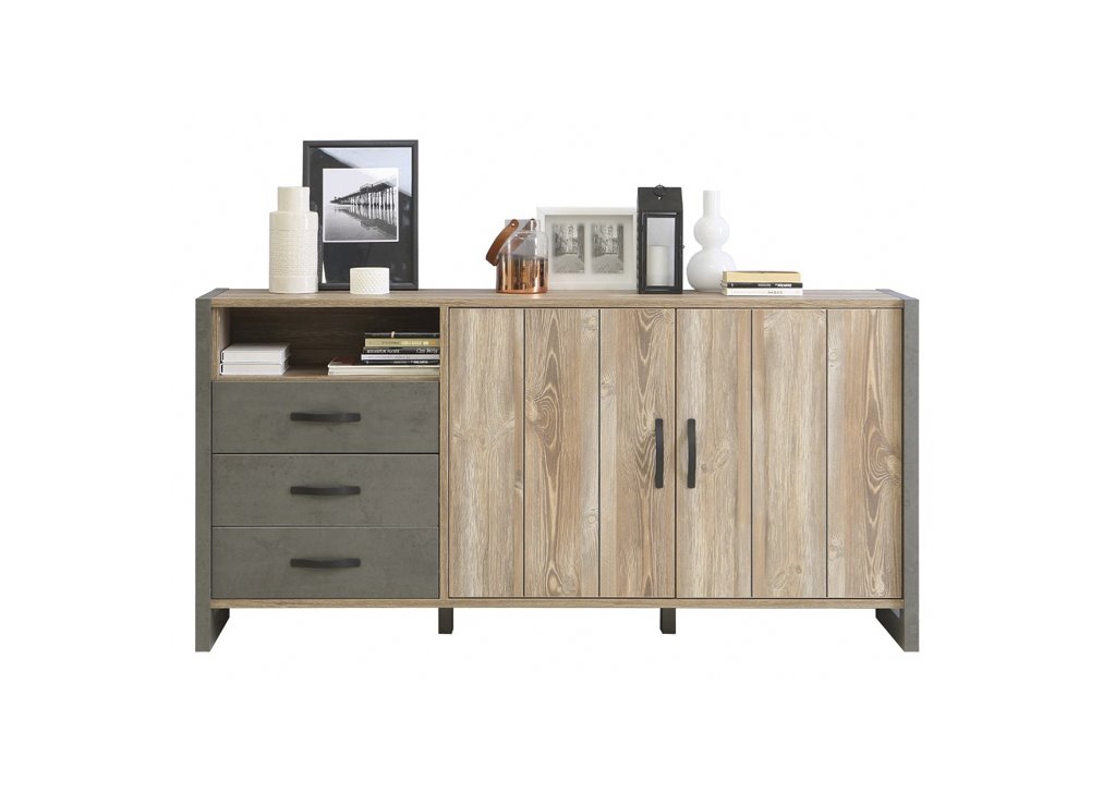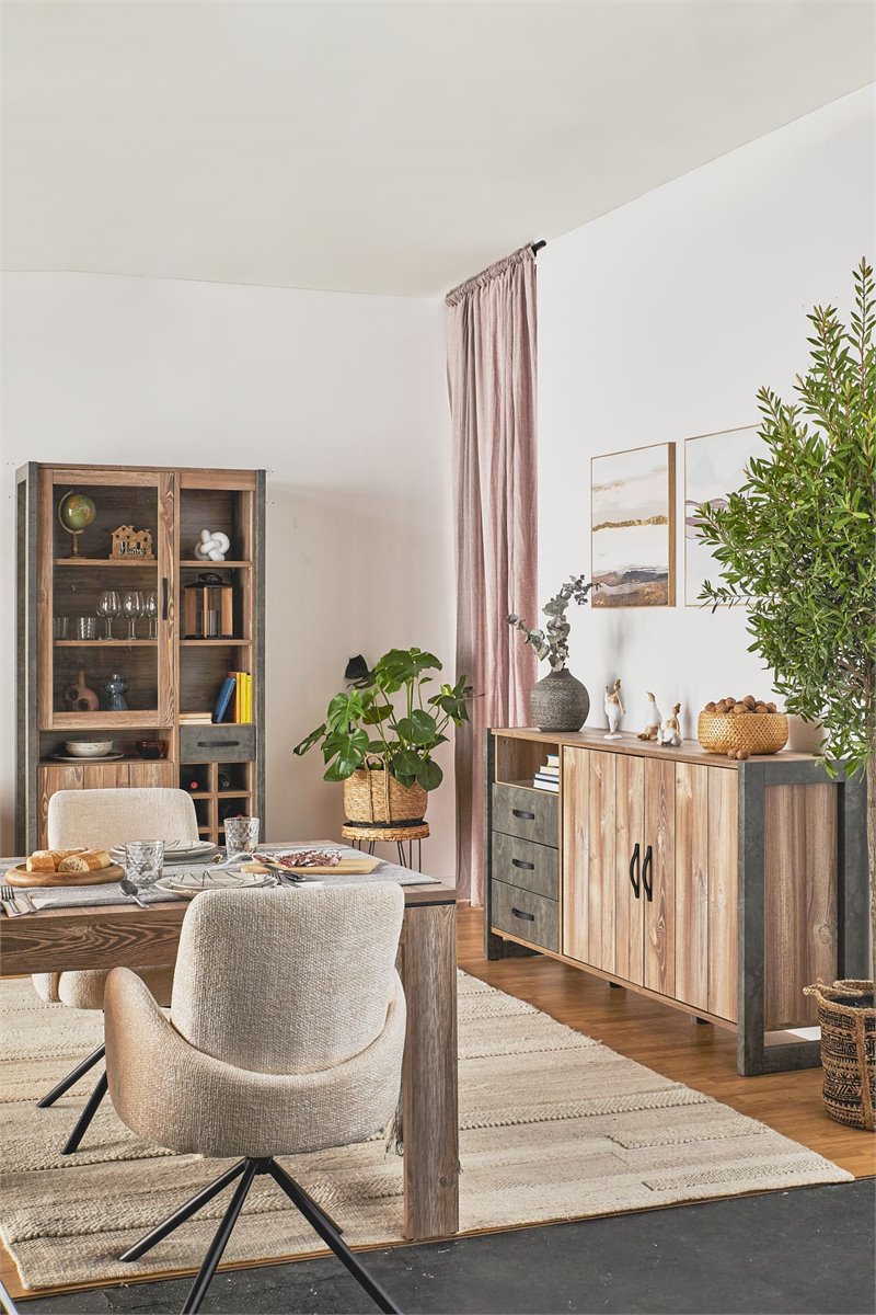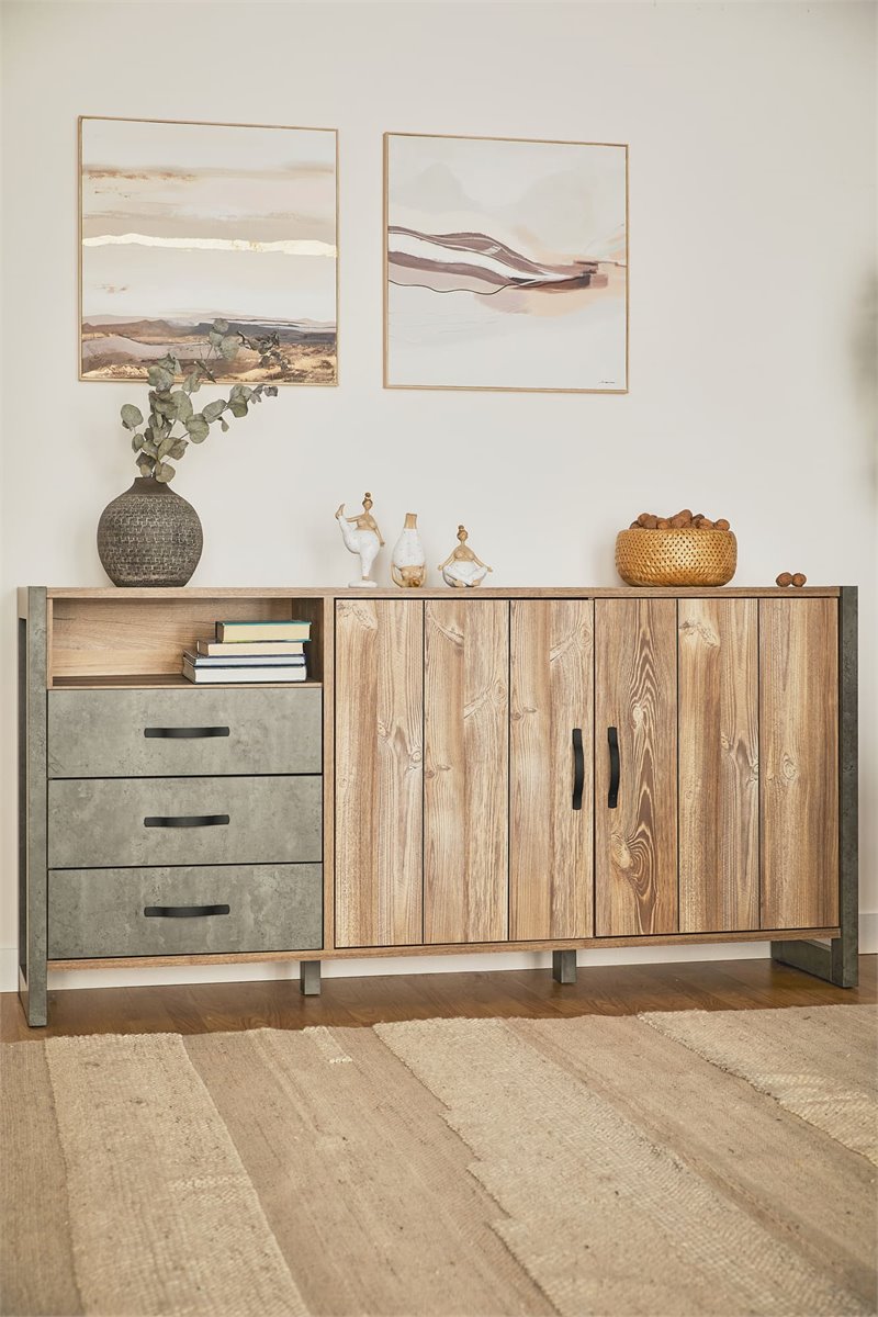 El aparador INDUSTRY aporta un toque decorativo a tu salón y su capacidad de almacenamiento lo hace muy práctico si necesitas guardar el menaje de la cocina a la hora de comer o cualquier otra cosa. Destaca por su diseño de líneas rectas y estilo industrial, perfecto si buscas un salón diáfano con cierto toque de loft. Aprovéchalo para ganar en espacio de almacenamiento y también para personalizar el salón con objetos decorativos encima de él. Diseño y funcionalidad están reunidos en el aparador de 2 puertas y 3 cajones INDUSTRY, con el que podrás decorar tu salón y utilizarlo para tener ordenadas tus cosas.