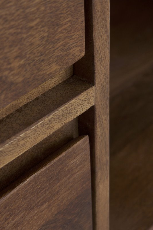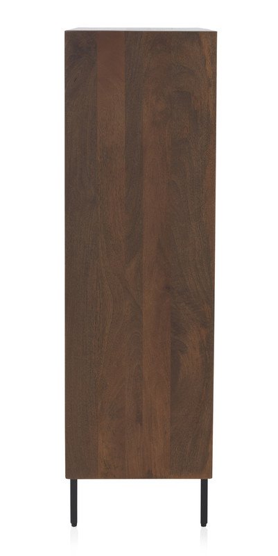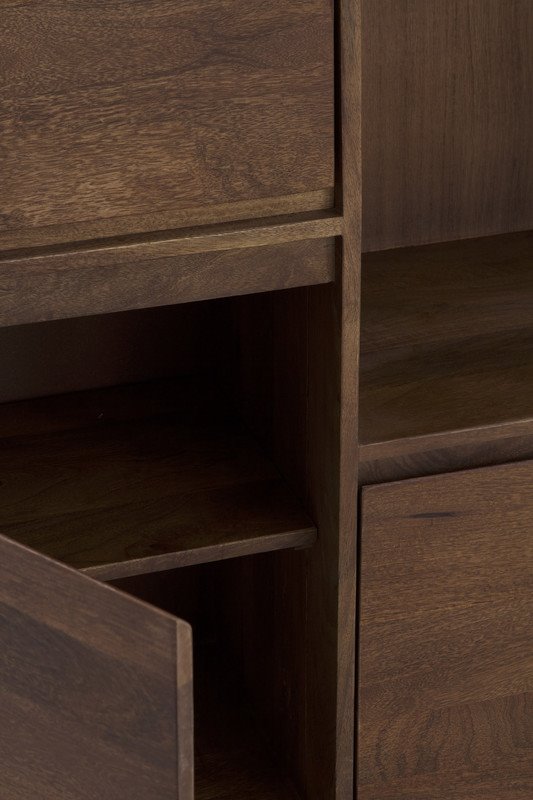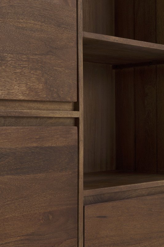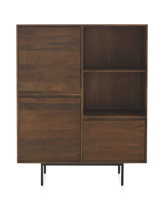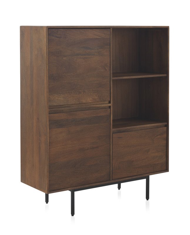 El aparador alto tiene tres puertas lisas de madera maciza de mango, con patas metálicas. Las puertas tienen apertura en uñero y bisagras de cierre suave. Detrás de las puertas hay un estante de media altura. La base es de metal negro y mide 13 cm de alto. No requiere montaje, sólo la fijación de la base del pie. Fabricado en madera maciza de mango natural, este mueble es elegante, robusto y funcional para guardar y organizar sus pertenencias.