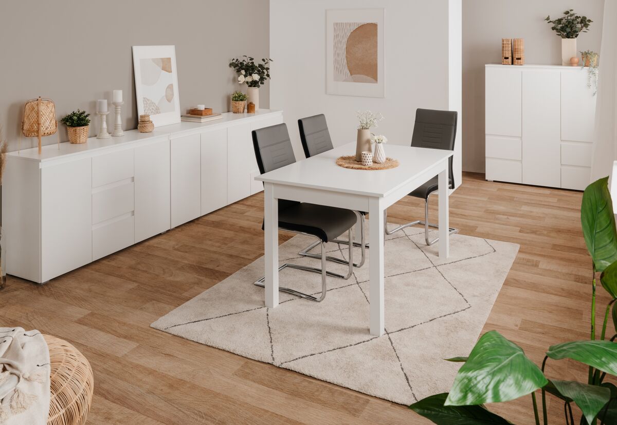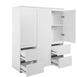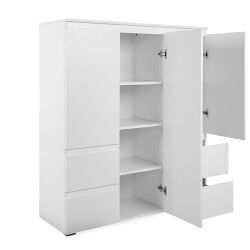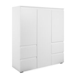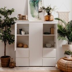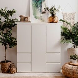 El aparador alto Skipper es perfecto para aquellos que buscan piezas que den un aspecto elegante y simple, pero que a la vez sean modernas y sofisticada. Este aparador tiene 3 puertas y 4 cajones . Está fabricado en tablero con partículas recubiertas de melamina en color totalmente blanco. Este apartador es ideal para guardar todo lo necesario para colocar la mesa, por ejemplo mantelería o cubiertos.
