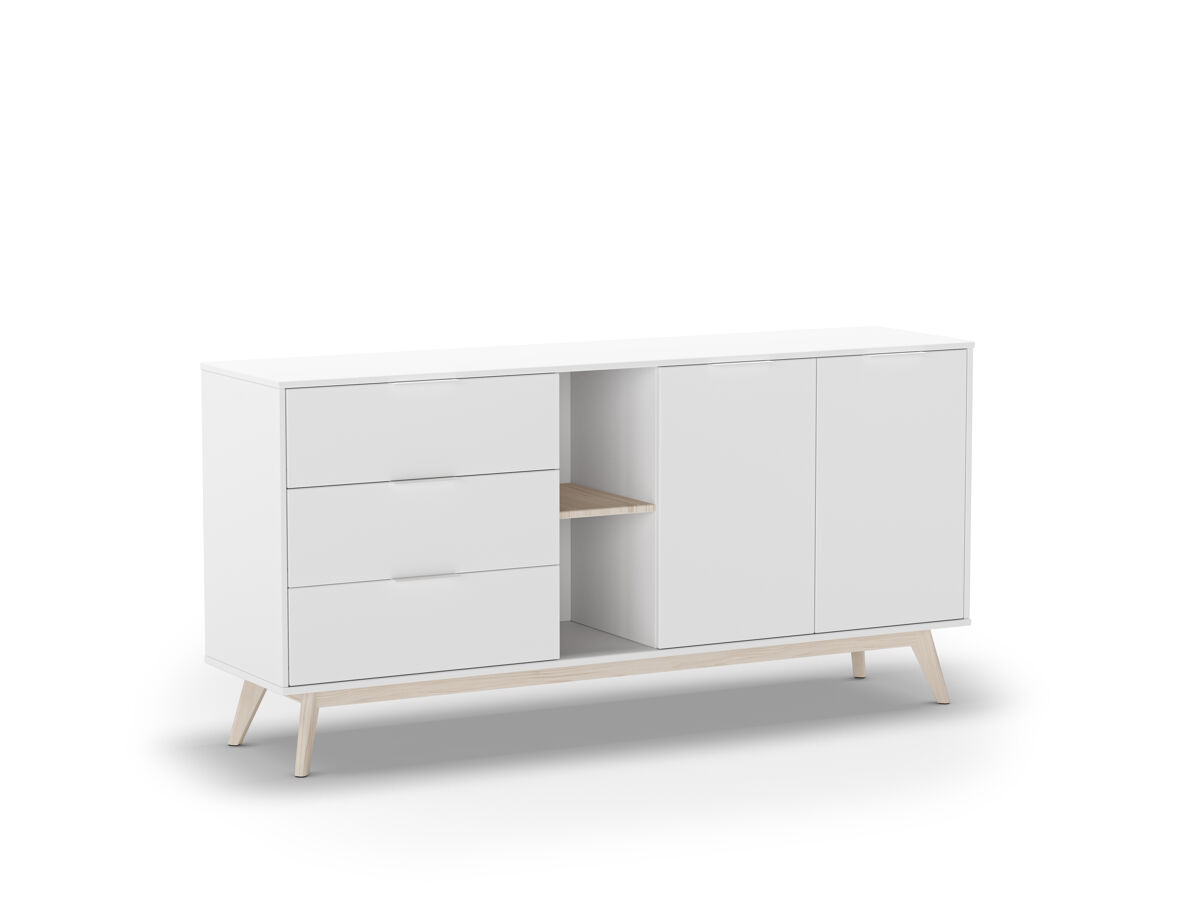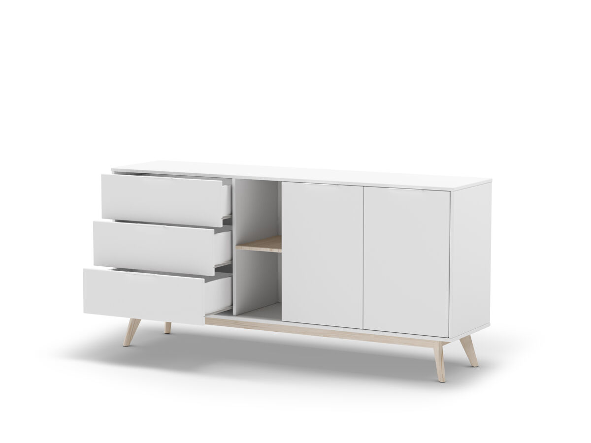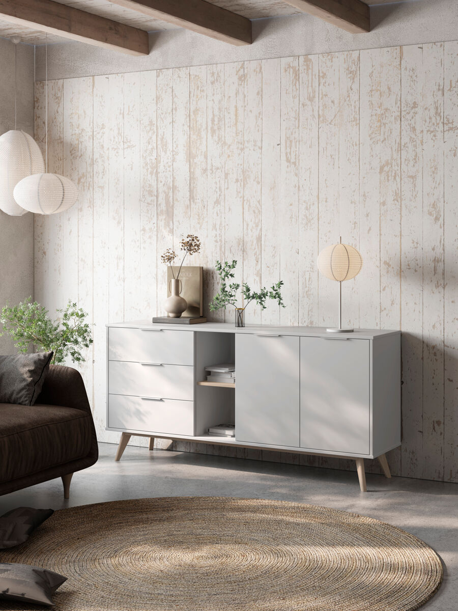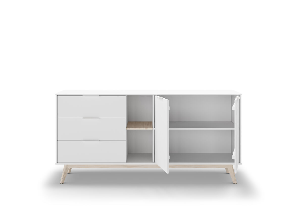 El aparador VOLGA, combina practicidad y estética para transformar cualquier espacio. Cuenta con 2 puertas principales, además de 2 puertas con huecos interiores, que permiten una organización eficiente y versátil. En el centro, dispone de 2 huecos exteriores ideales para exhibir objetos decorativos o libros, junto con 3 cajones que ofrecen espacio extra para mantener el orden. Su estructura está fabricada en madera de pino con acabado en blanco, un tono moderno que aporta frescura y elegancia. Las patas en color madera natural brindan un contraste cálido que complementa el diseño.