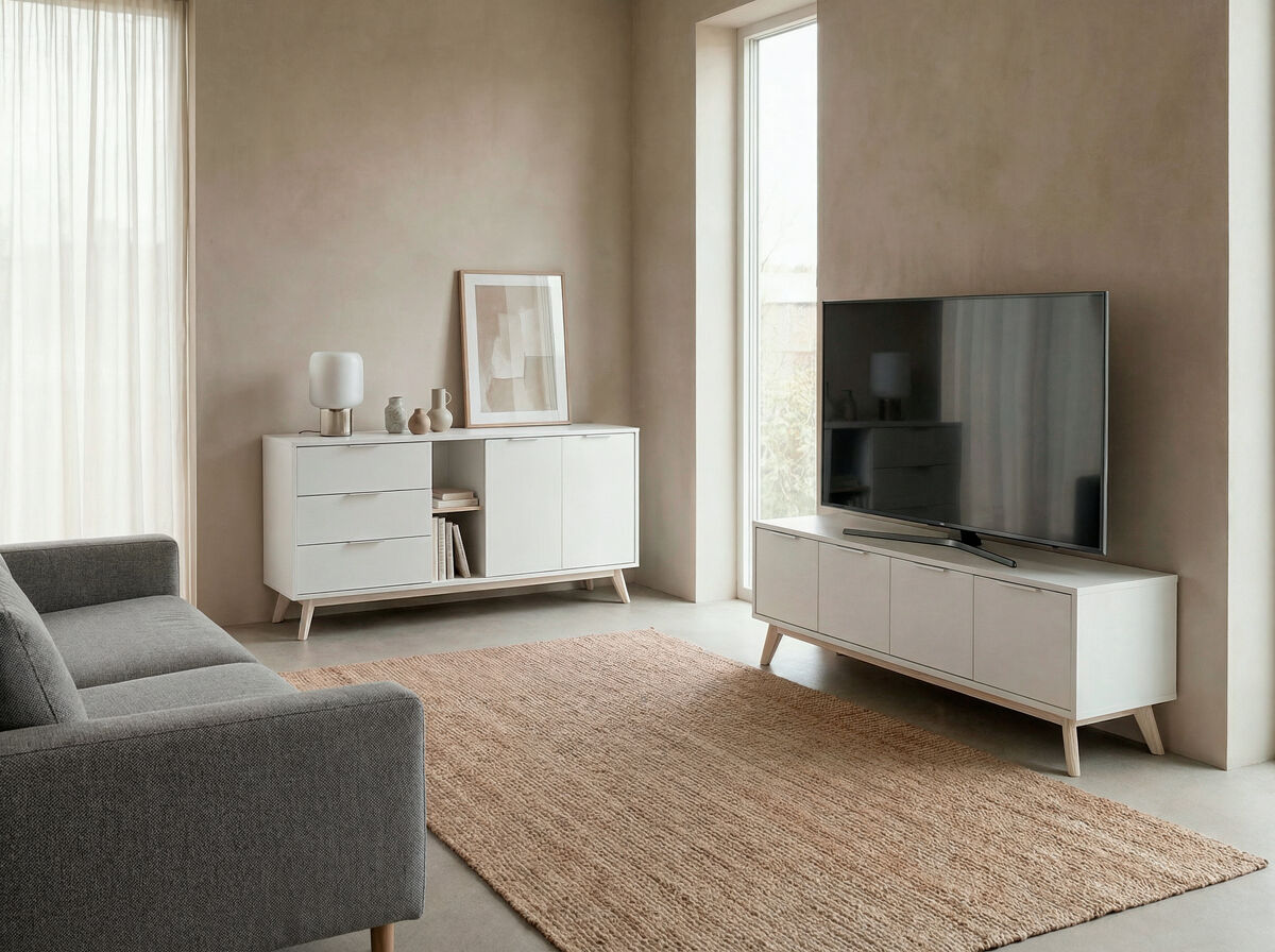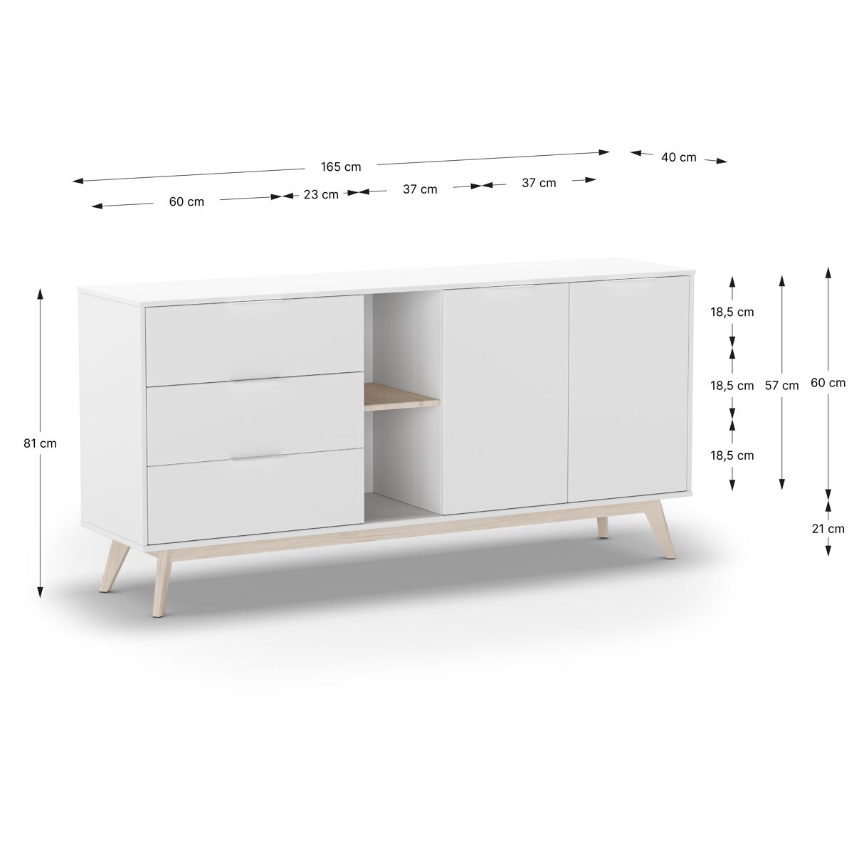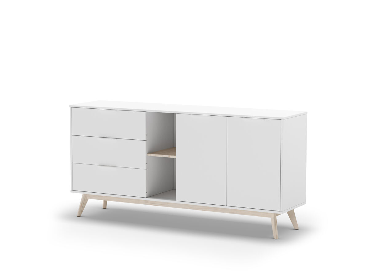 El aparador VOLGA, combina practicidad y estética para transformar cualquier espacio. Cuenta con 2 puertas principales, además de 2 puertas con huecos interiores, que permiten una organización eficiente y versátil. En el centro, dispone de 2 huecos exteriores ideales para exhibir objetos decorativos o libros, junto con 3 cajones que ofrecen espacio extra para mantener el orden. Su estructura está fabricada en madera de pino con acabado en blanco, un tono moderno que aporta frescura y elegancia. Las patas en color madera natural brindan un contraste cálido que complementa el diseño.