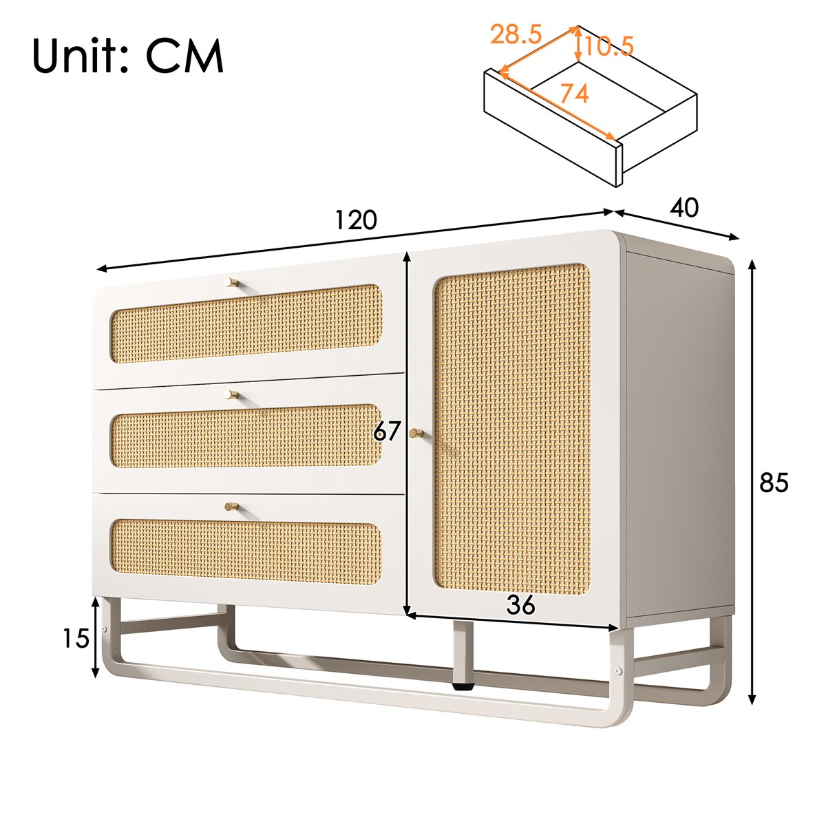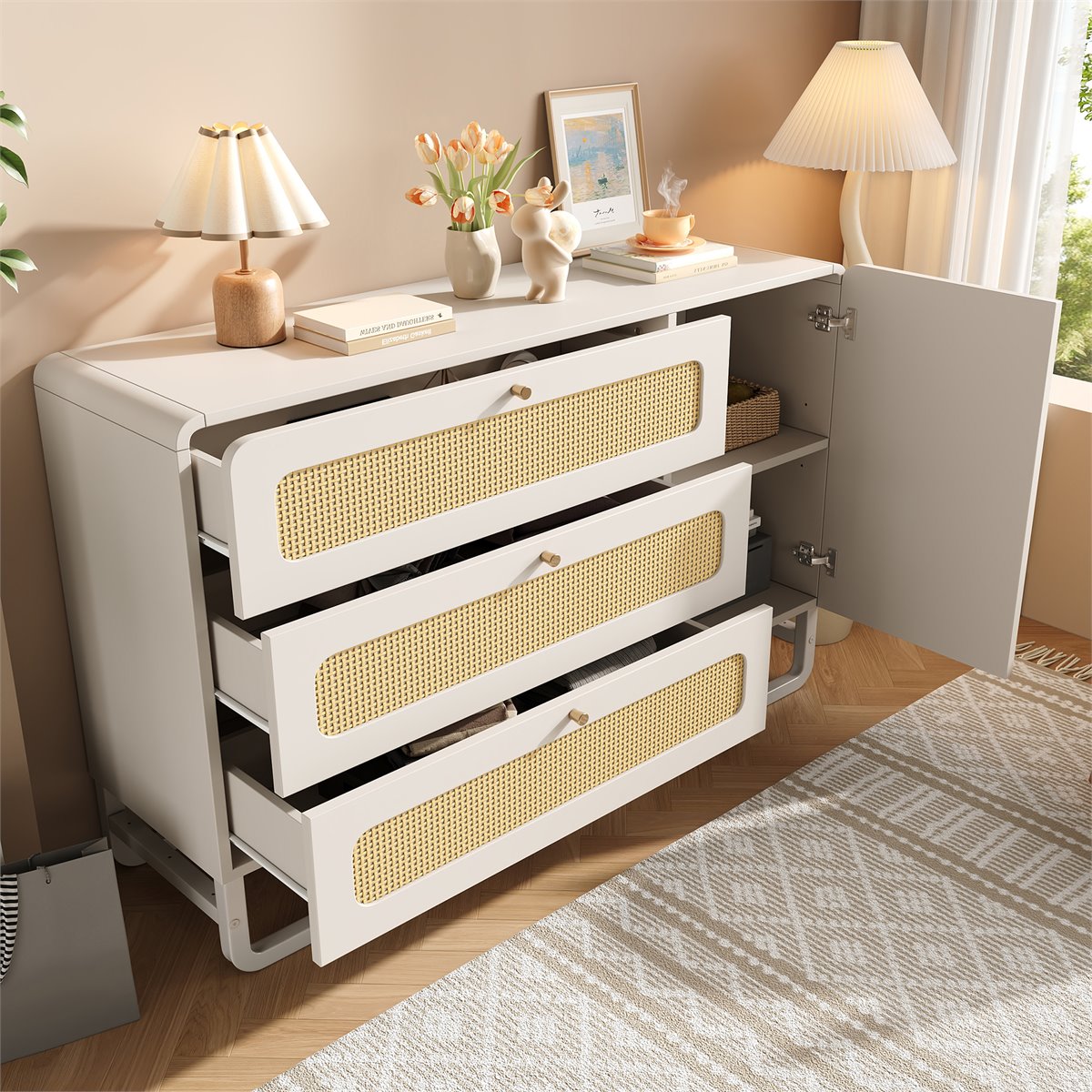 Estilo rústico natural y diseño curvo: Esta cómoda está fabricada con paneles de madera de alta calidad con acabado blanco. Los cajones y las puertas están adornados con ratán amarillo y tiradores de metal dorado, creando una paleta de colores claros y un cálido estilo rústico. La combinación perfecta de decoración y espacio de almacenamiento complementa la decoración de cualquier habitación.