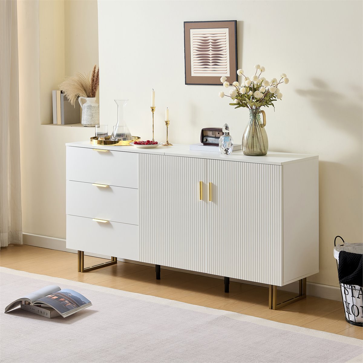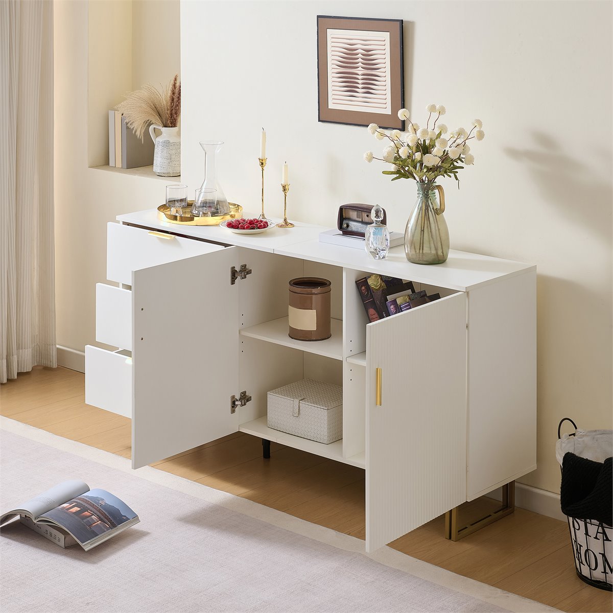 Amplio espacio de almacenamiento: Tres cajones y dos puertas ofrecen amplio espacio para utensilios y objetos decorativos.
