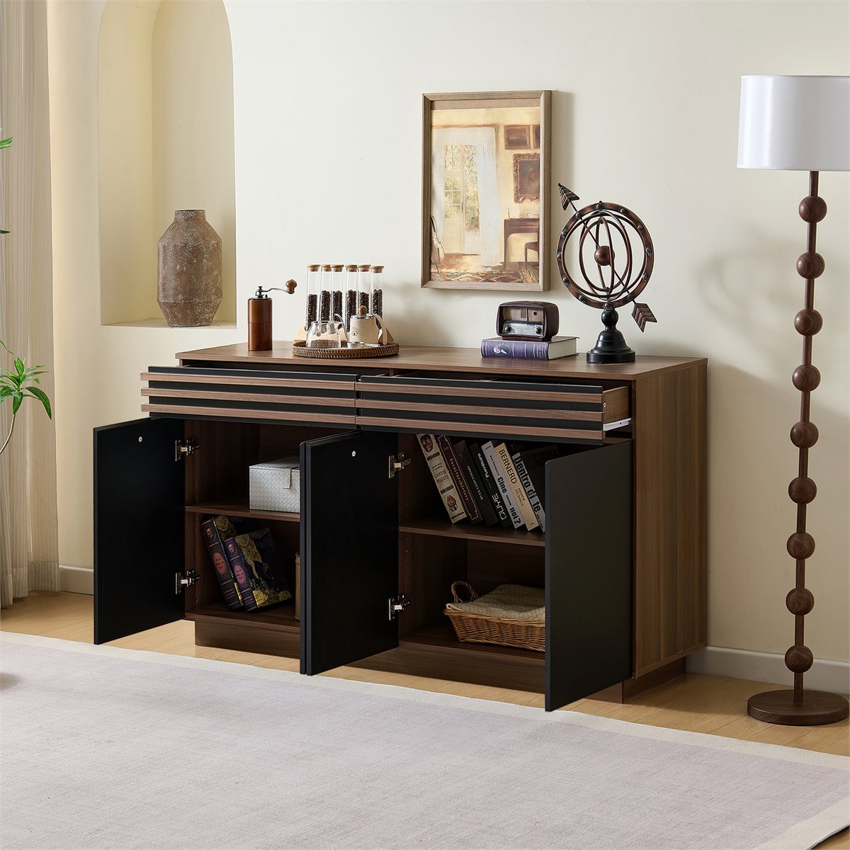AMPLIO ESPACIO DE ALMACENAMIENTO – Dos cajones y cuatro puertas con estantes ajustables ofrecen amplio espacio para platos, vasos, manteles y otros utensilios.
