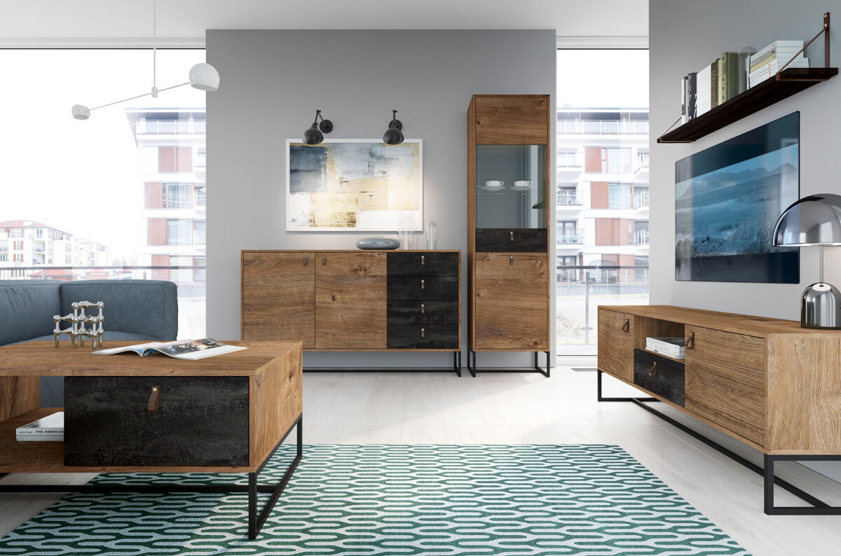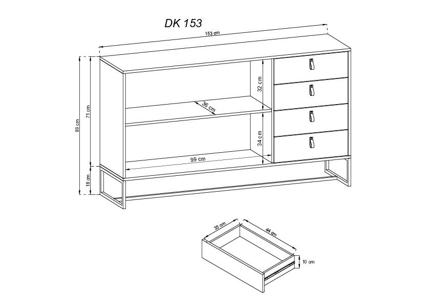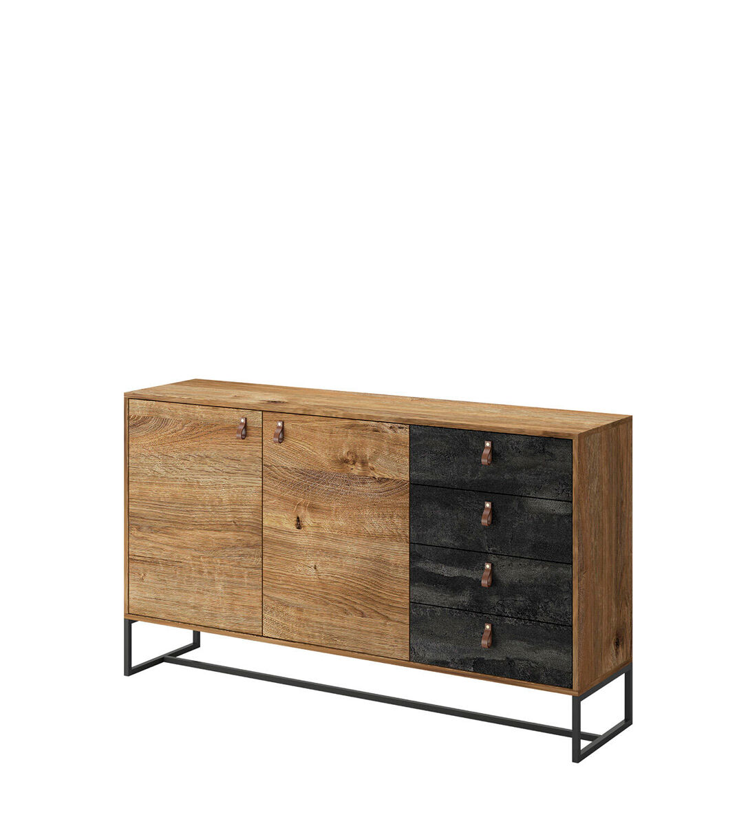 Maximice su salón o comedor con el aparador DARK. Este importante aparador, de 89 cm de altura, presenta una rica mezcla de acabados en roble y grafito en sus 153 cm de ancho. Incluye cuatro cajones y dos puertas con bisagras, ofreciendo un amplio espacio de almacenamiento envuelto en una estética moderna que sin duda impresionará.