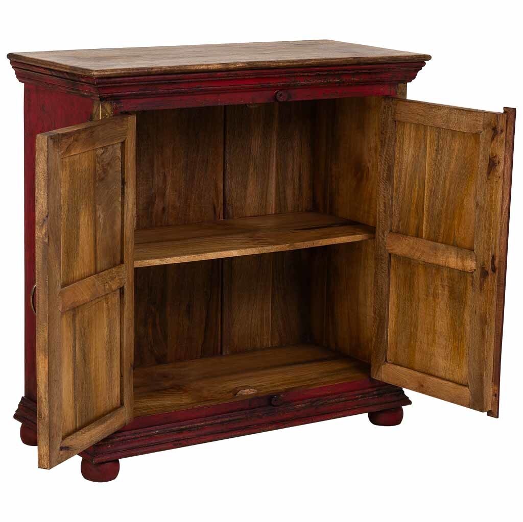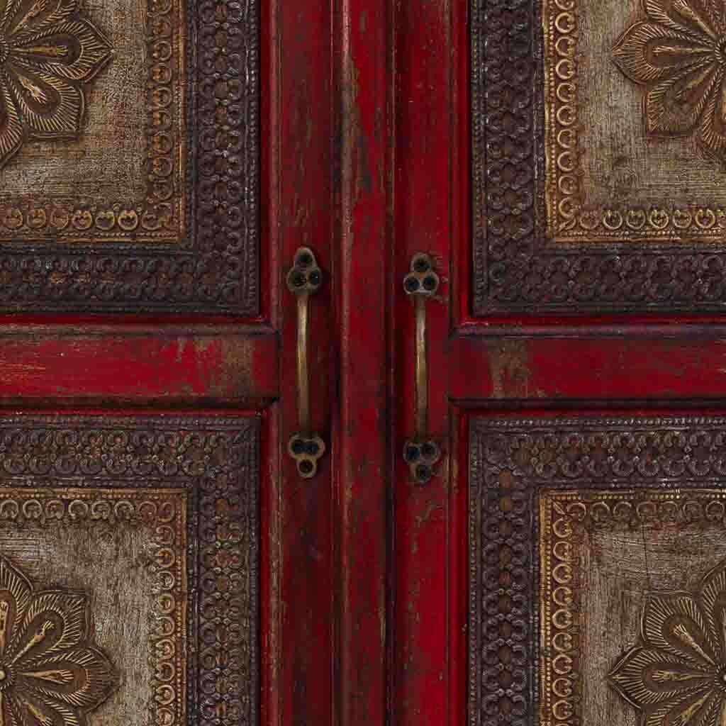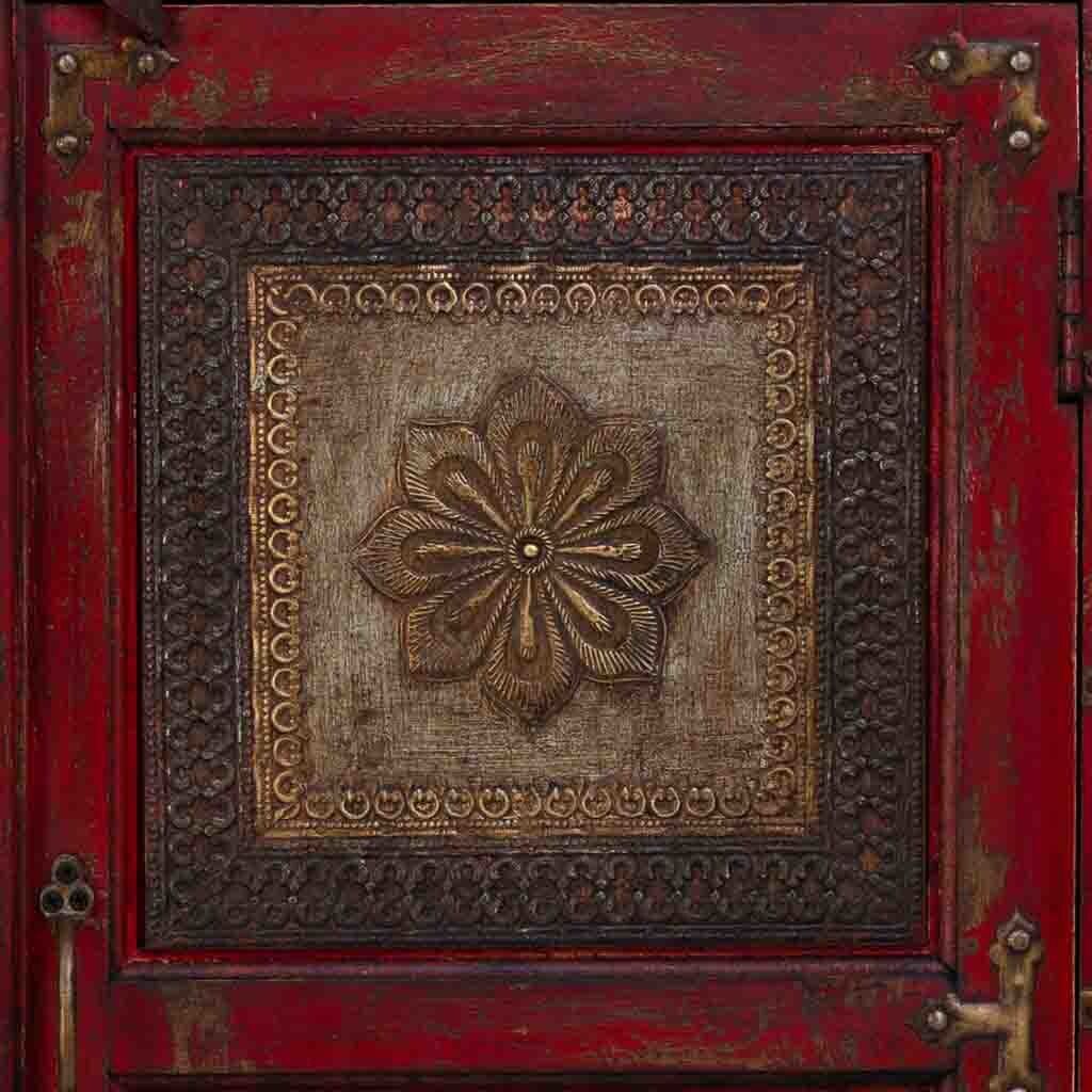 Aparador de madera con detalles tallados artesanalmente en color rojo. Con sus dimensiones de 90x40x90 cm, es una pieza única que aporta un toque de estilo vintage y artesanal a tu hogar.