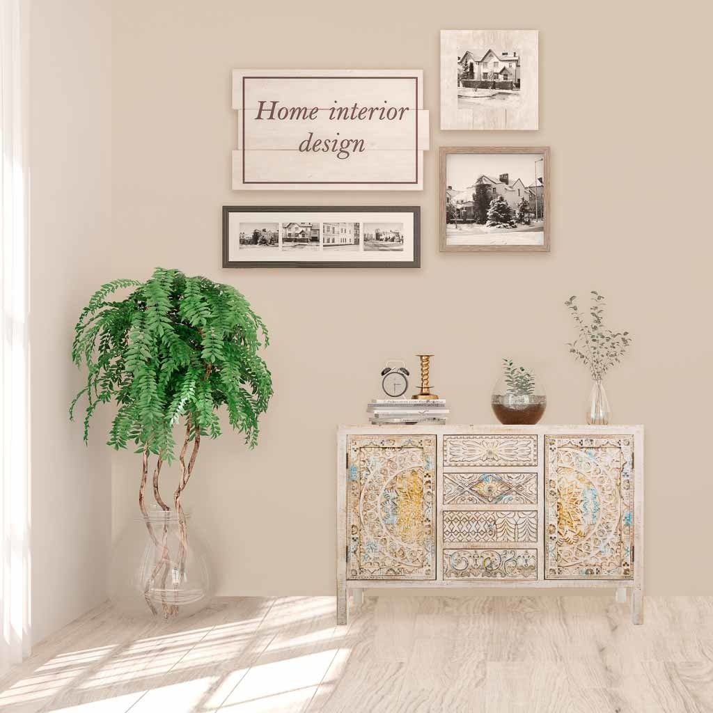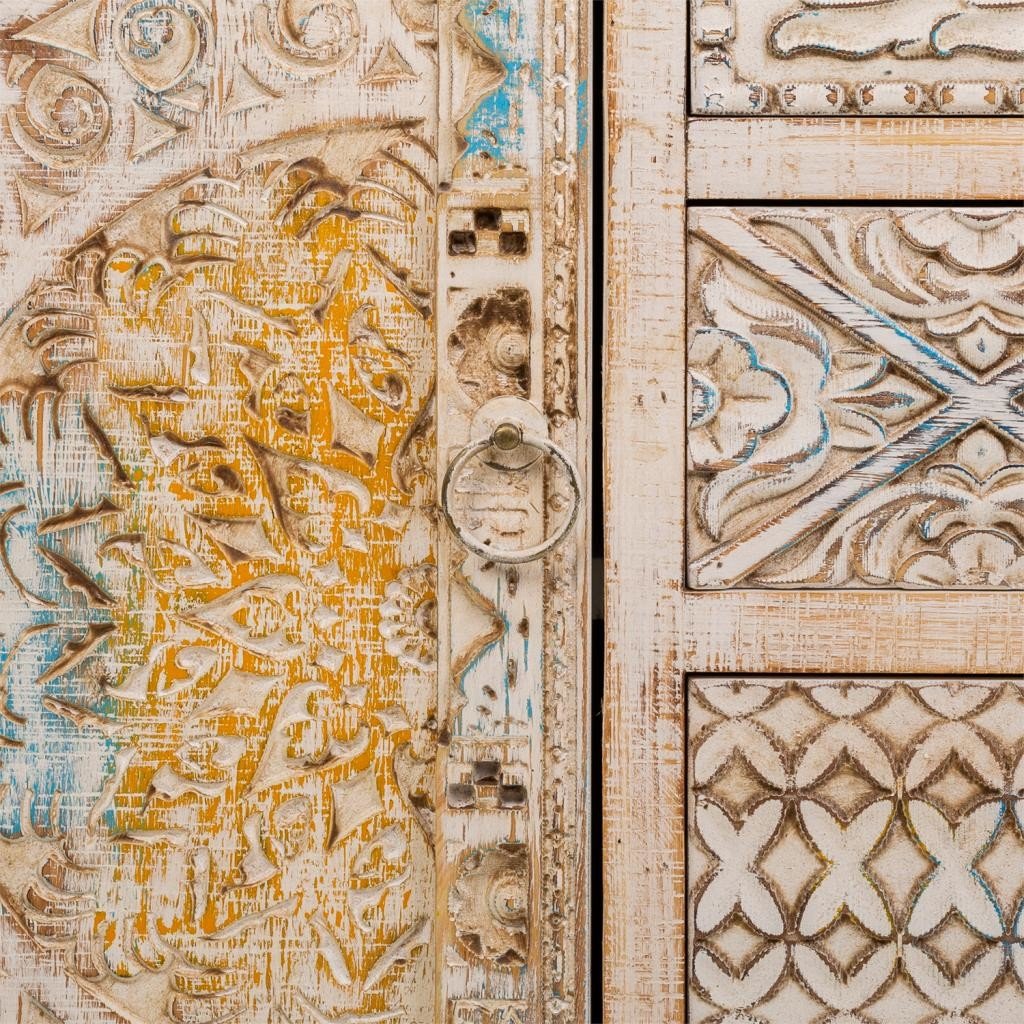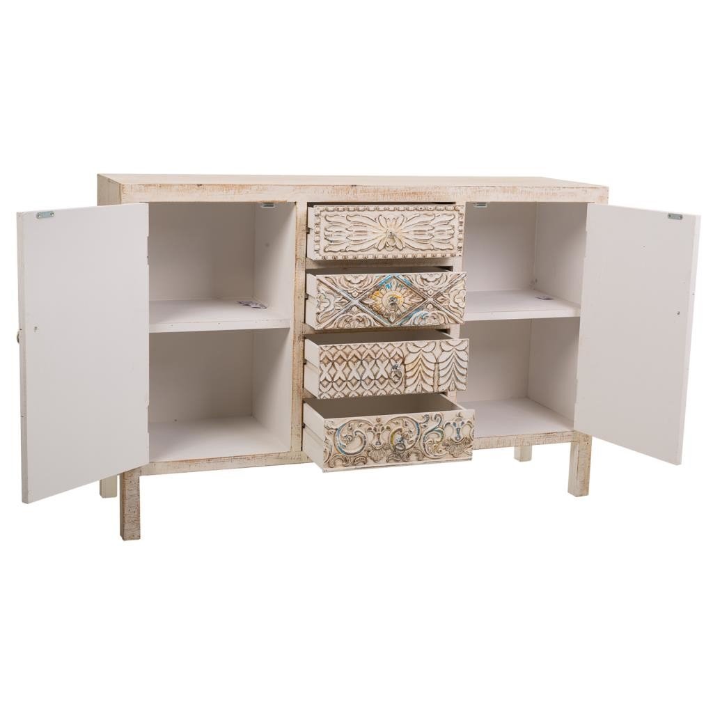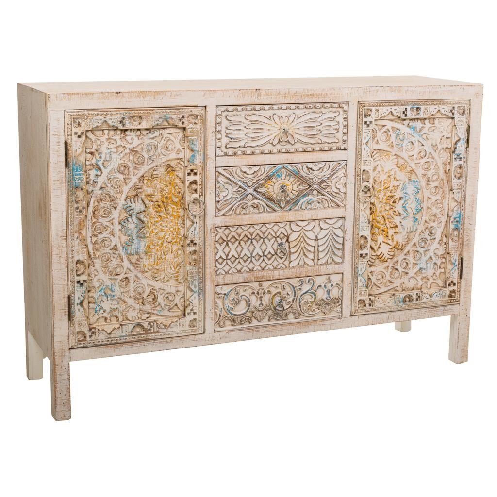 Aparador de madera tallada, con un diseño único para tu hogar. Medidas: 120 cm de largo, 35 cm de profundidad y 80 cm de altura.