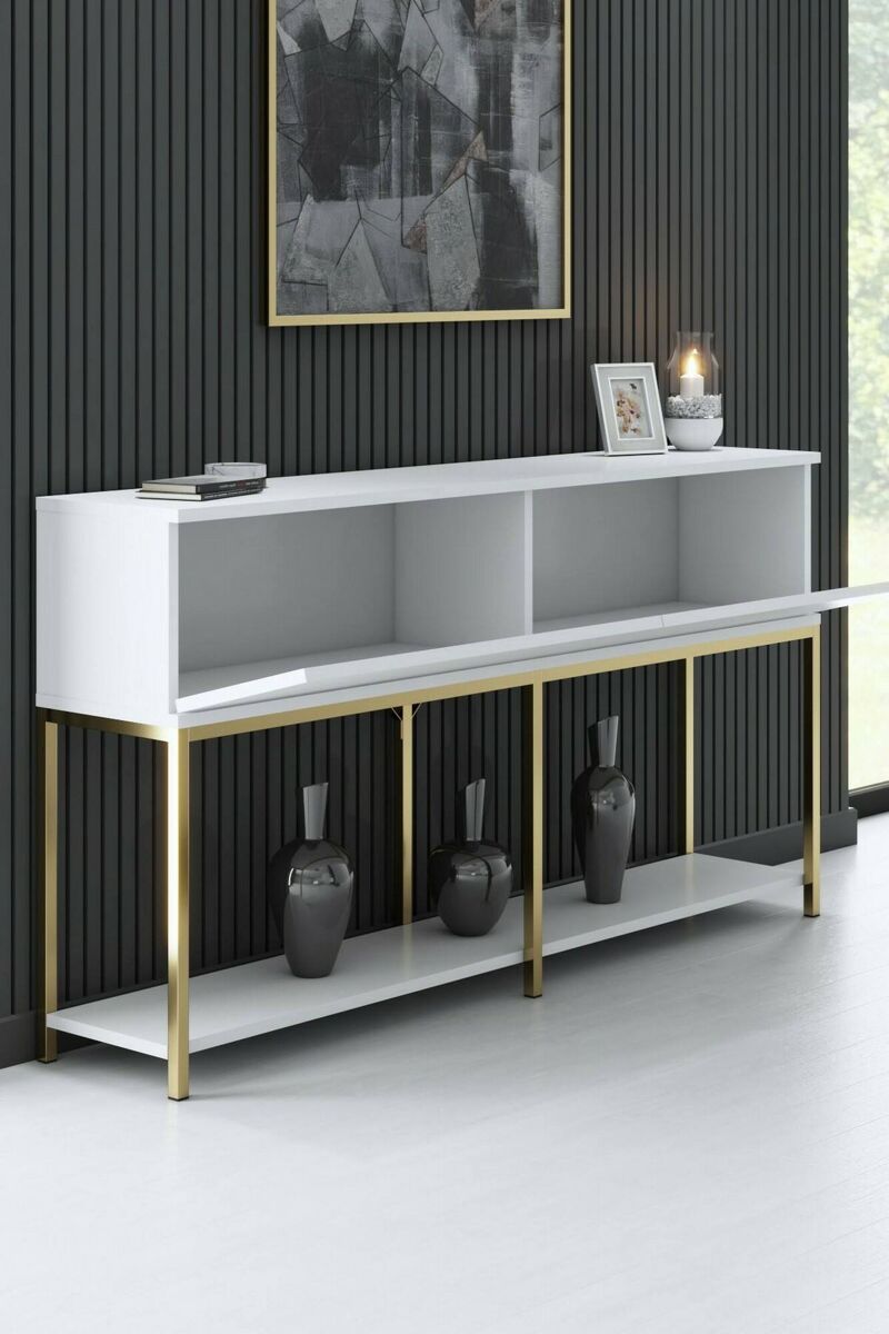 CREDENZA - Buffet de sala, Aparador de sala, Despensa de cozinha, 150x30h80 cm, Branco e Dourado.
