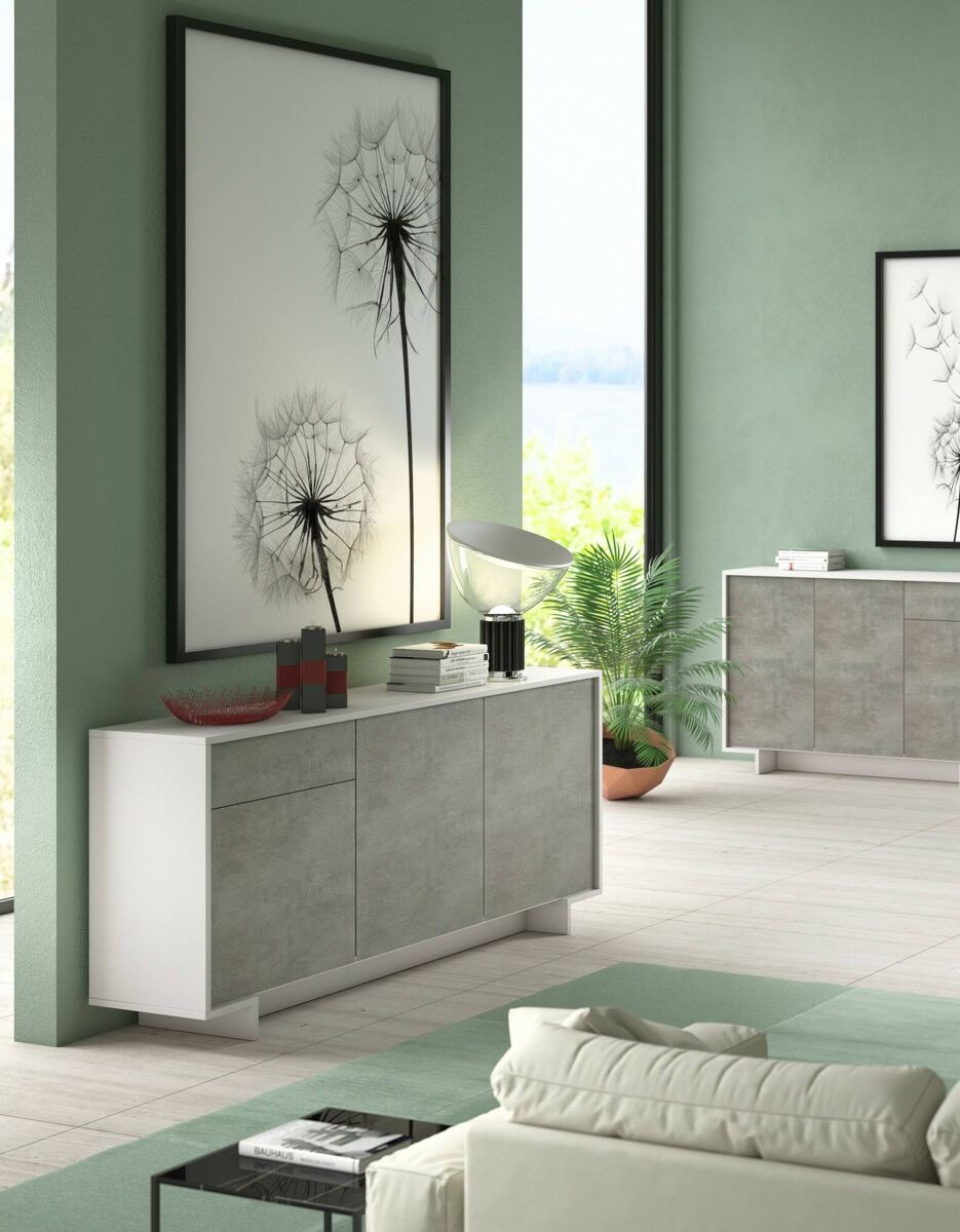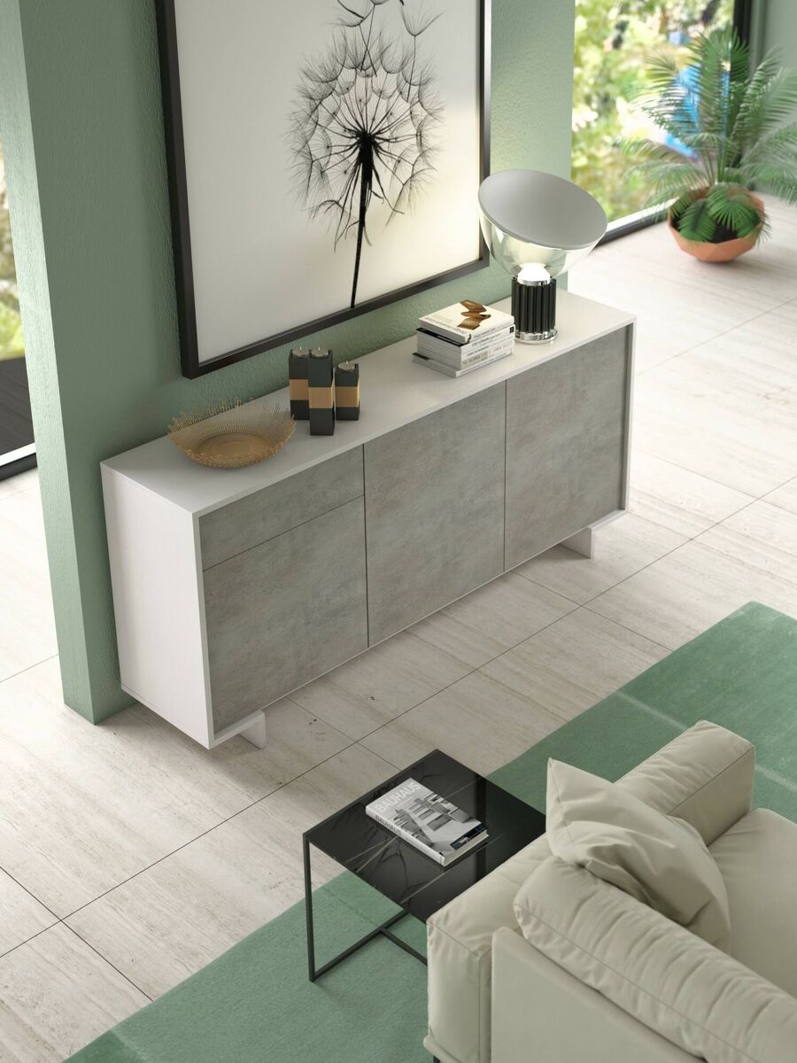 CREDENZA - Aparador de sala, Buffet de sala com 3 portas e 1 gaveta, 100% Made in Italy, 170x42h78 cm, Branco e Cimento ESTRUTURA E UTILIZAÇÃO - Móveis de sala práticos e compactos, estruturados com três portas de batente e uma gaveta -.