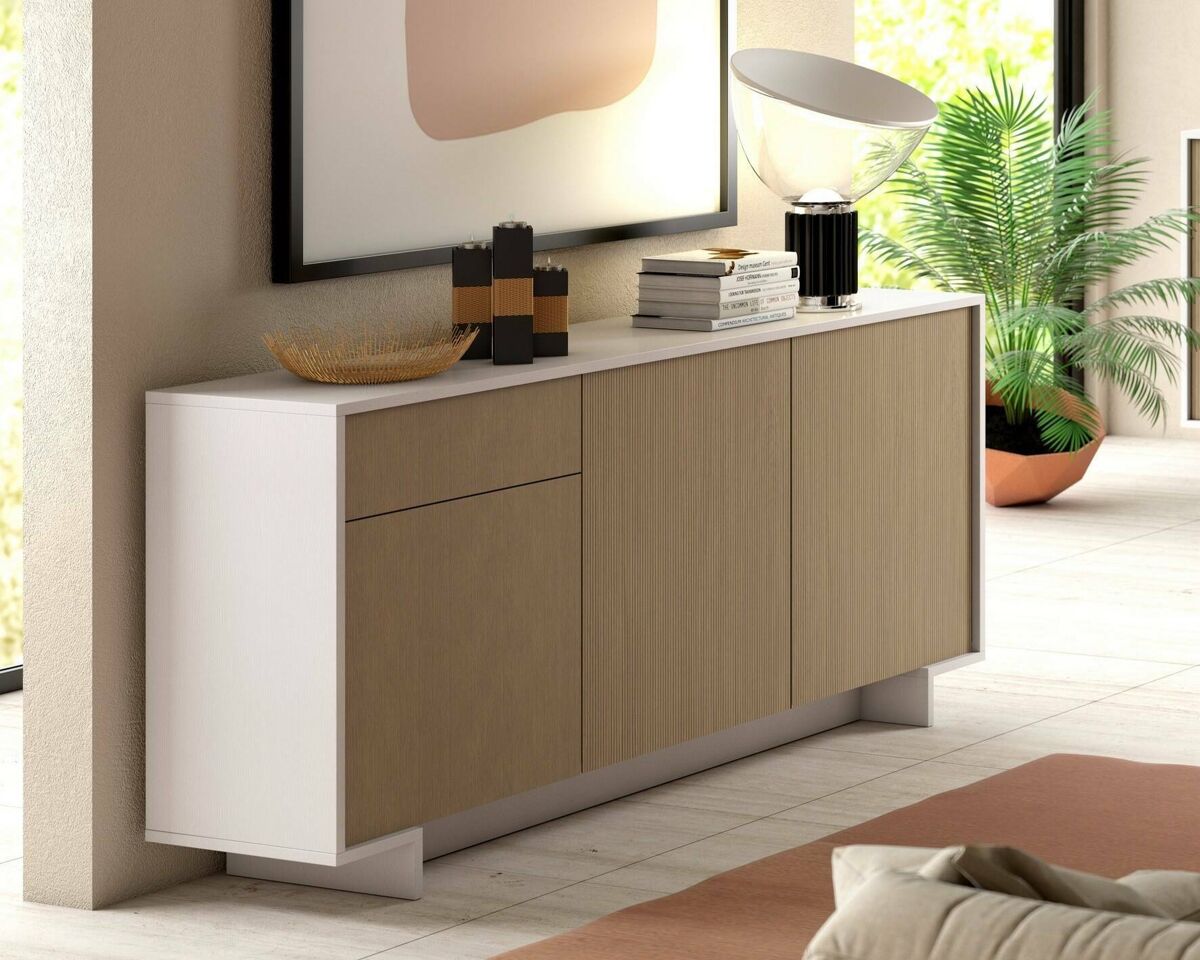 CREDENZA - Aparador de sala, Buffet de sala com 3 portas e 1 gaveta, 100% Made in Italy, 170x42h78 cm, Branco e Carvalho ESTRUTURA E UTILIZAÇÃO - Móveis de sala práticos e economizadores de espaço estruturados com três portas de batente e uma gaveta -.