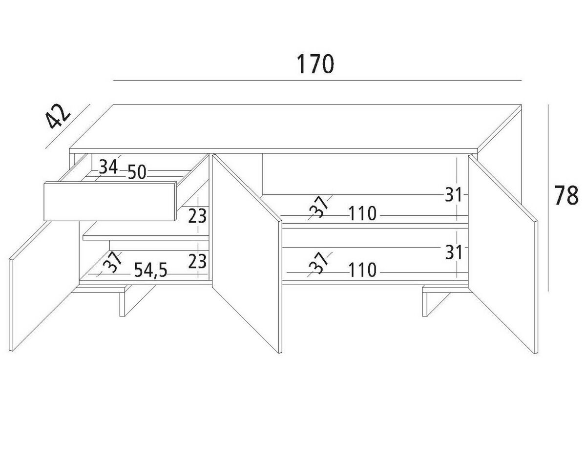 CARACTERÍSTICAS TÉCNICAS - Construída inteiramente em painéis de aglomerado melamínico, é resistente a impactos e riscos e tem durabilidade ao longo do tempo - Equipada com portas de batente com sistema de fecho push-pull - Limpeza rápida e fácil graças ao o material de que é feito - Fornecido desmontado com kit de montagem e manual de instruções - Especial cuidado e atenção à embalagem, que é resistente e adequada para transporte - Painel melamínico certificado FSC, a espessura de 18 mm garante alta resistência dos materiais, alta resultado estético graças ao acabamento de altíssima definição - Peso máximo suportado para cada prateleira: 10 Kg DIMENSÕES EM CM, Aparador: Comprimento: 170 Largura: 42 Altura: 78.