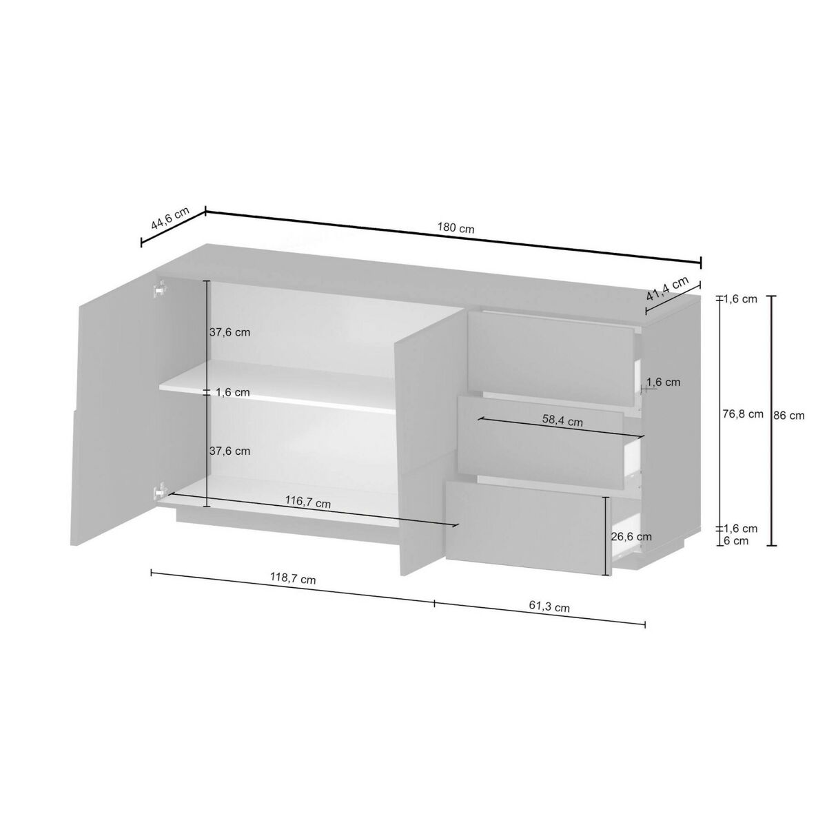 DIMENSÕES EM CM - Aparador: Comprimento: 180 Largura: 44 Altura: 86