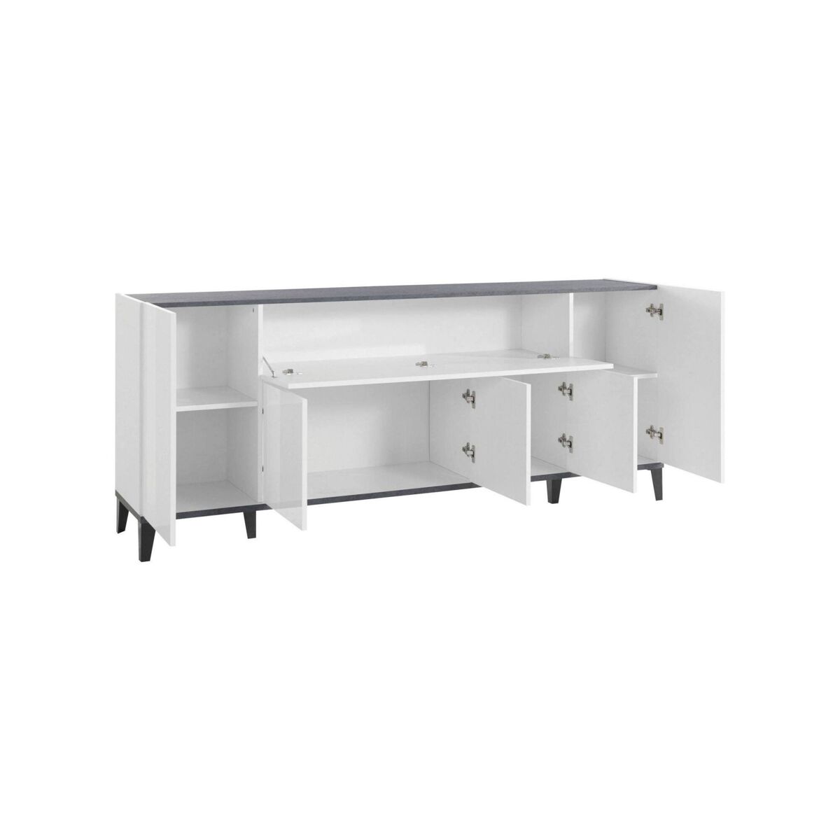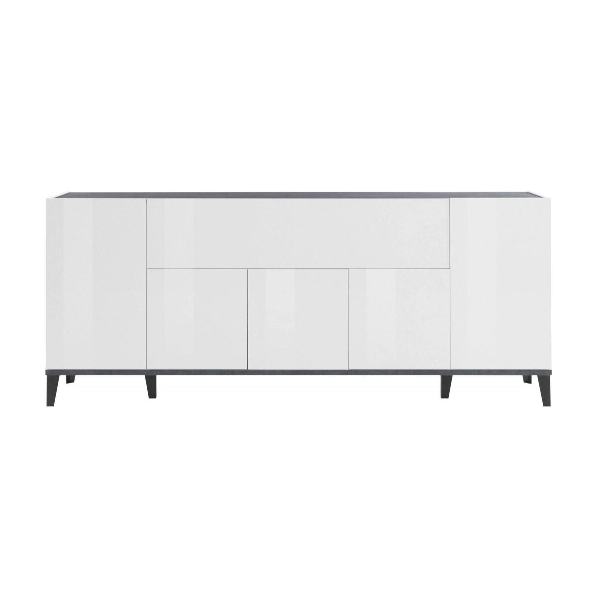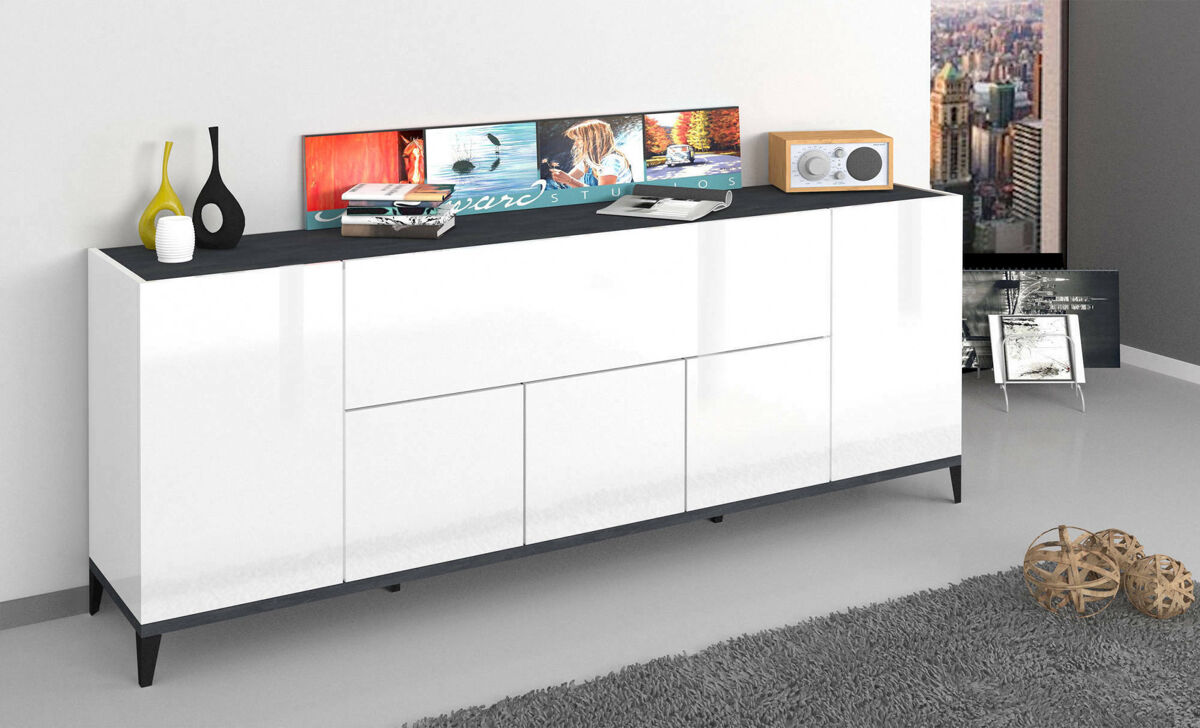 ESTRUTURA E UTILIZAÇÃO - Aparador de sala prático e economizador de espaço, estruturado com seis portas, uma das quais com abas, estruturado no interior com prateleiras confortáveis - As portas são sem puxadores e equipadas com dobradiças maciças e guias metálicas, abertura realizada através de um empurrão -sistema pull - A estrutura é inteiramente em branco brilhante e ardósia - A prateleira superior é perfeita para acomodar sua televisão ou suas bugigangas favoritas.