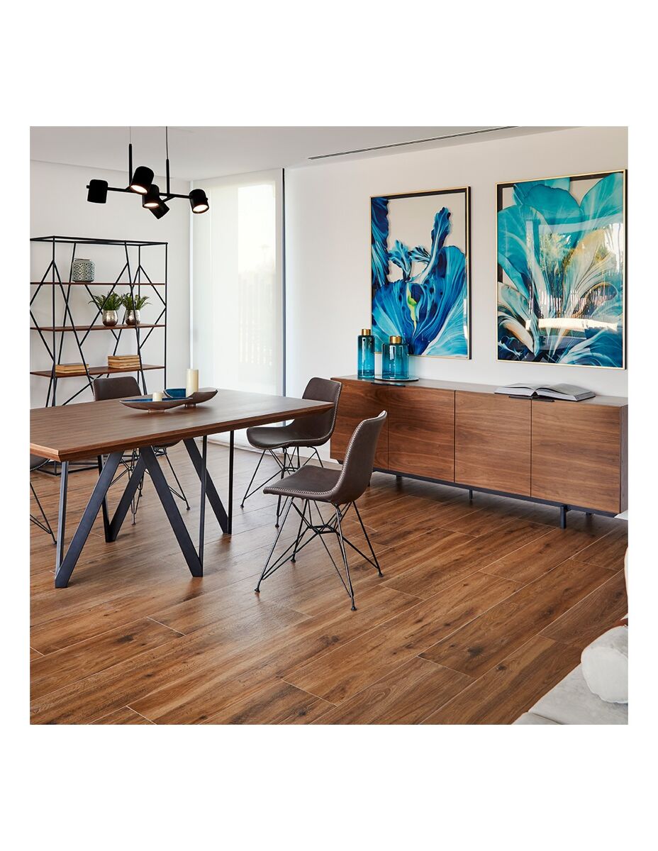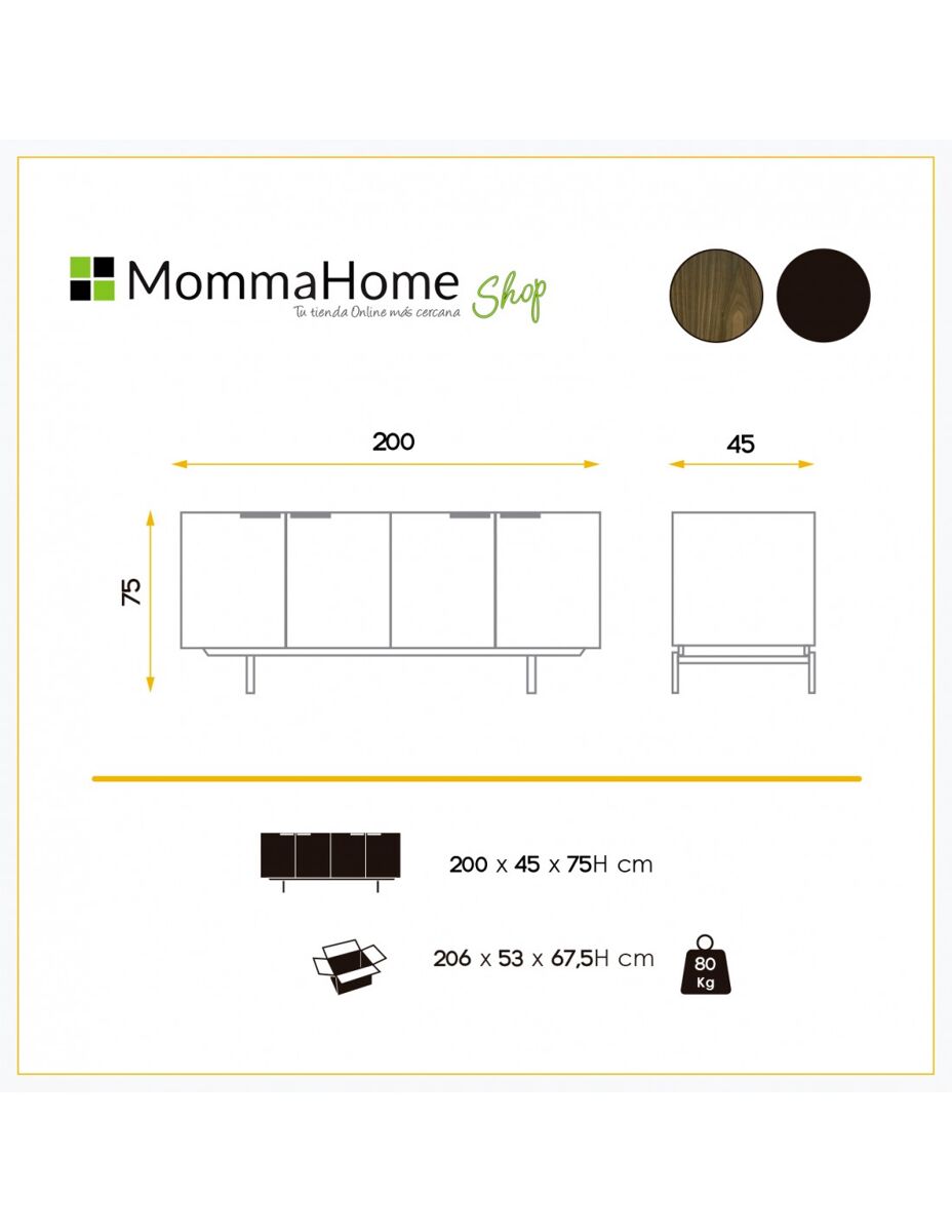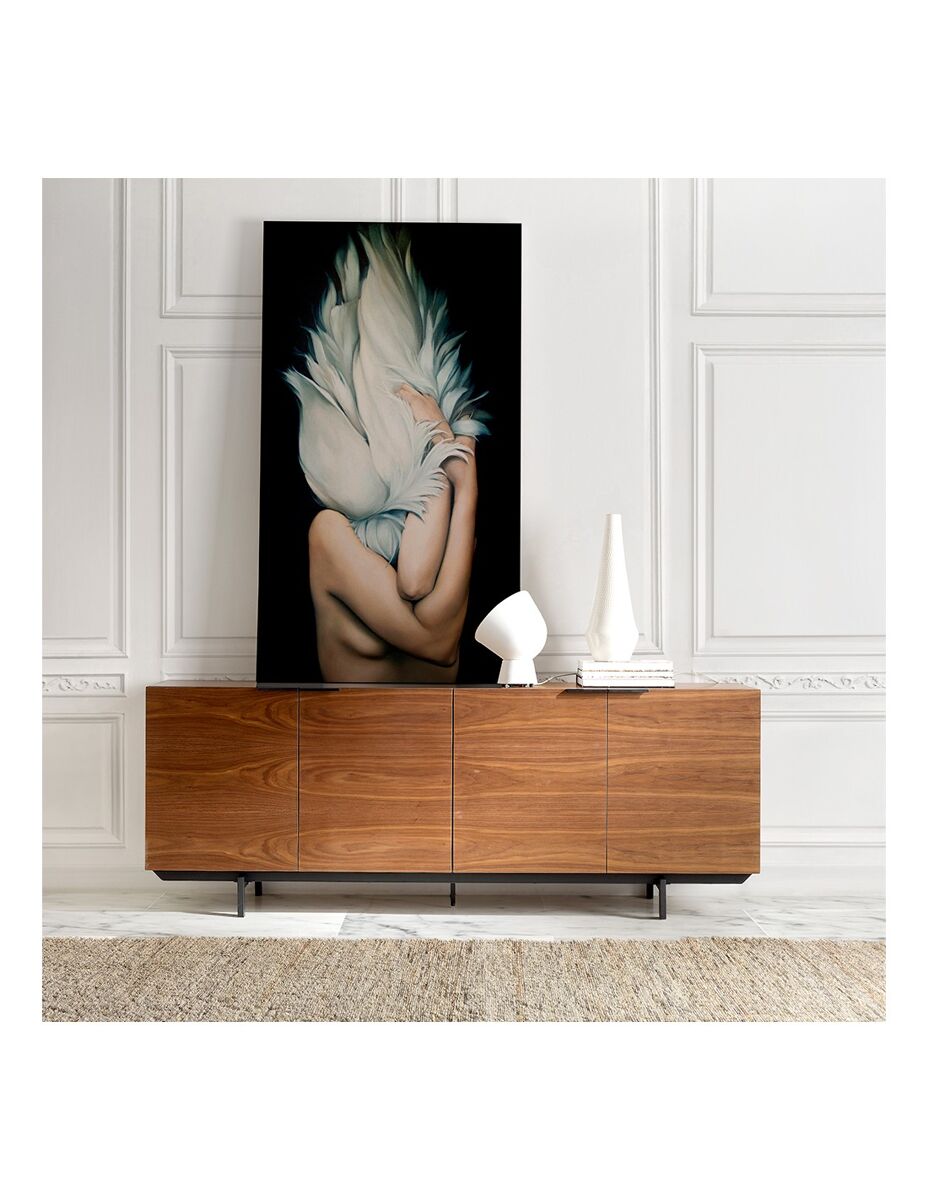 Aparador LONDON con cuatro puertas, de madera MDF acabada en nogal. Estructura y tiradores metálicos pintados en negro mate. Requiere pequeño montaje. Incluye herrajes y manual de instrucciones. Medidas: 200 x 45 x 75H cm.