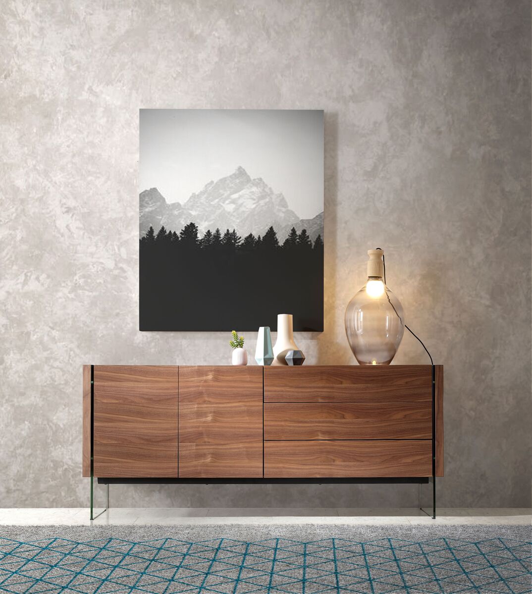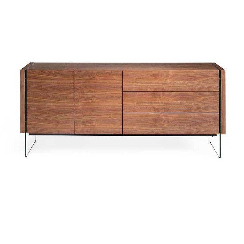 Aparador VALETA de dos puertas y tres cajones acabado en MDF acabado en chapa de Nogal y patas de vidrio templado de 12 mm de grosor. Requiere pequeño montaje. Incluye herrajes y manual de instrucciones. Medidas: 180 x 49 x 77H cm.