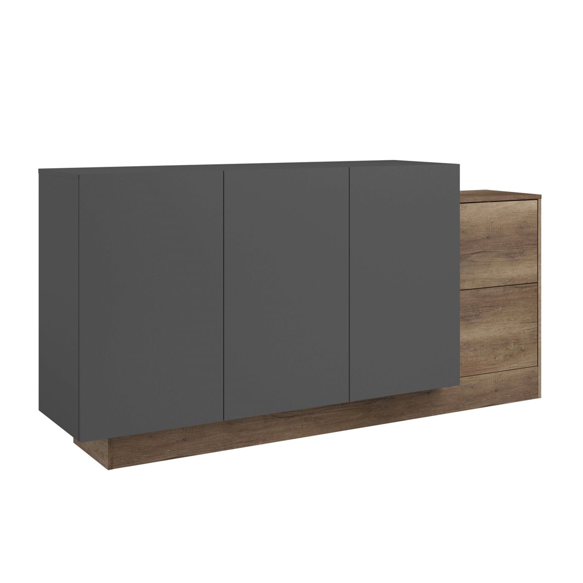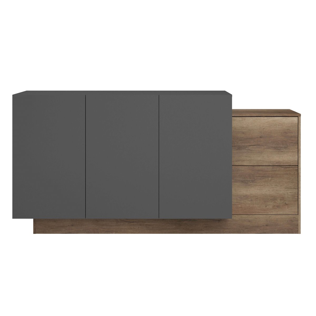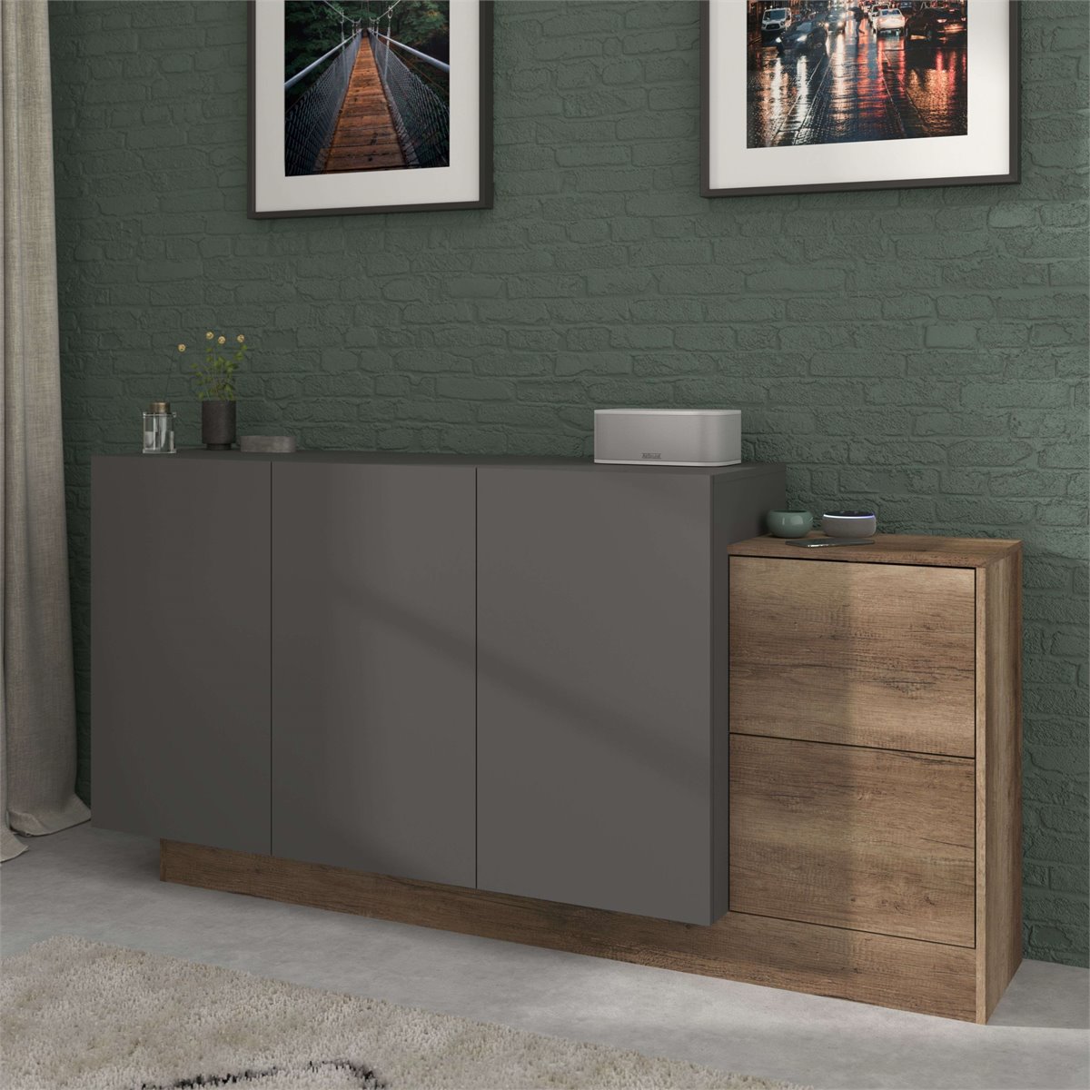 El aparador de salón Opec en gris y roble authe combina de manera efectiva el color frío del gris con el cálido tono roble, generando un impacto visual acogedor y moderno en la sala de estar. Con su estilo contemporáneo, se integra perfectamente en espacios tanto modernos como tradicionales, aportando una sensación de equilibrio y frescura al entorno. Sus líneas limpias y la armonía de sus colores lo convierten en un elemento que enriquece la estética del hogar, ofreciendo un toque actual y agradable al ambiente. Fabricado en melamina, este aparador de salón ofrece mayor resistencia y un acabado atractivo. Está compuesto por 3 puertas que ocultan estantes internos para optimizar el almacenamiento, y 2 cajones ideales para objetos más pequeños. Las dimensiones del mueble aseguran su capacidad para adaptarse a distintos espacios. Mejora tu hogar con este aparador de alta funcionalidad y adquiere una solución de almacenamiento compacta y eficiente hoy mismo. Medidas: Medidas: Ancho: 184 cm, Alto: 88,6 cm, Profundidad: 33 cm. Se trata de mobiliario con kit de montaje, que incluye manual de instrucciones y tornillería.