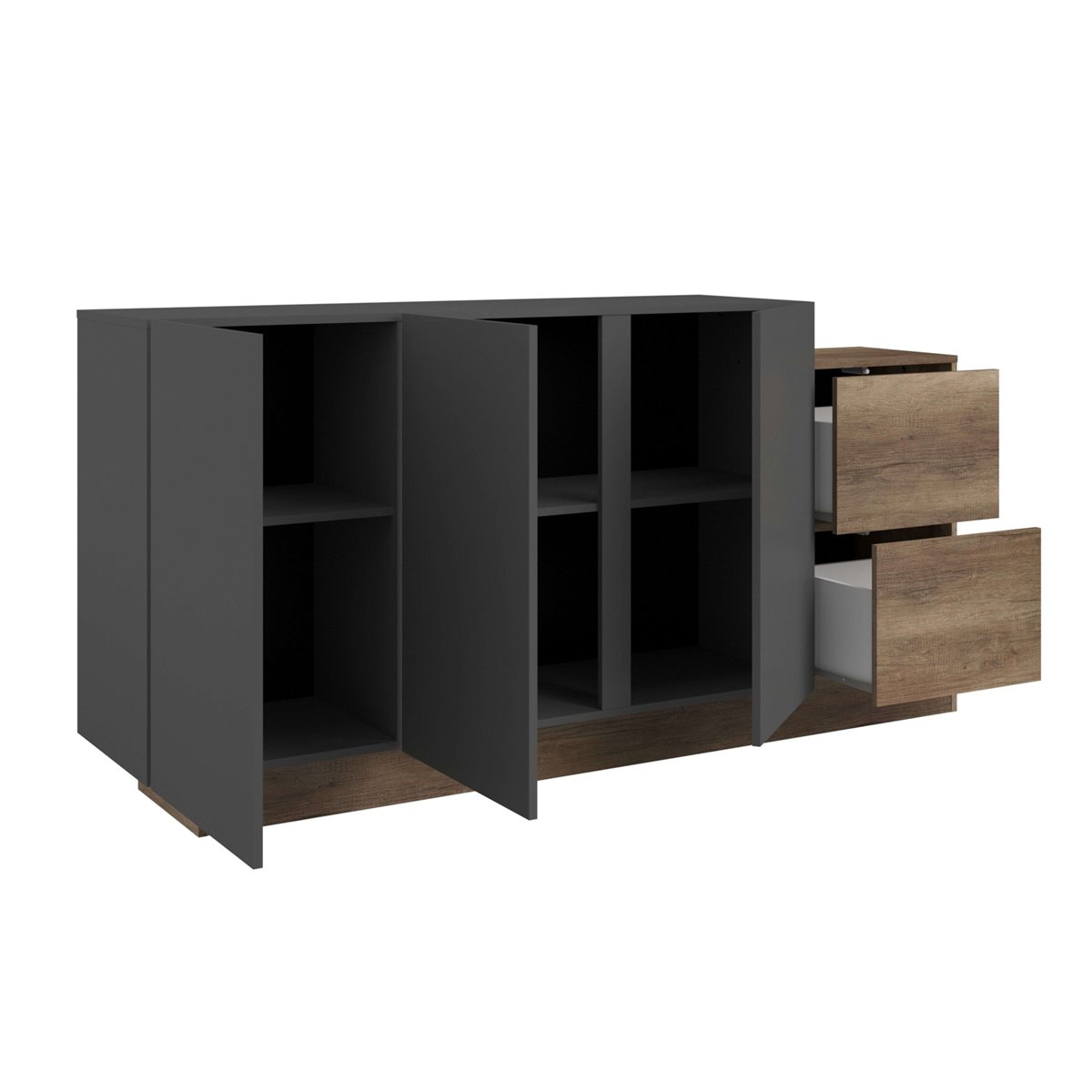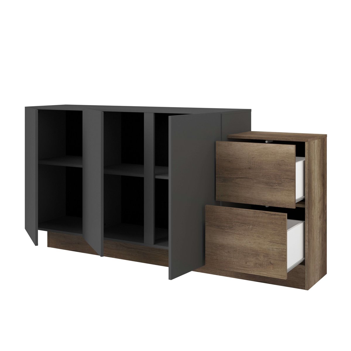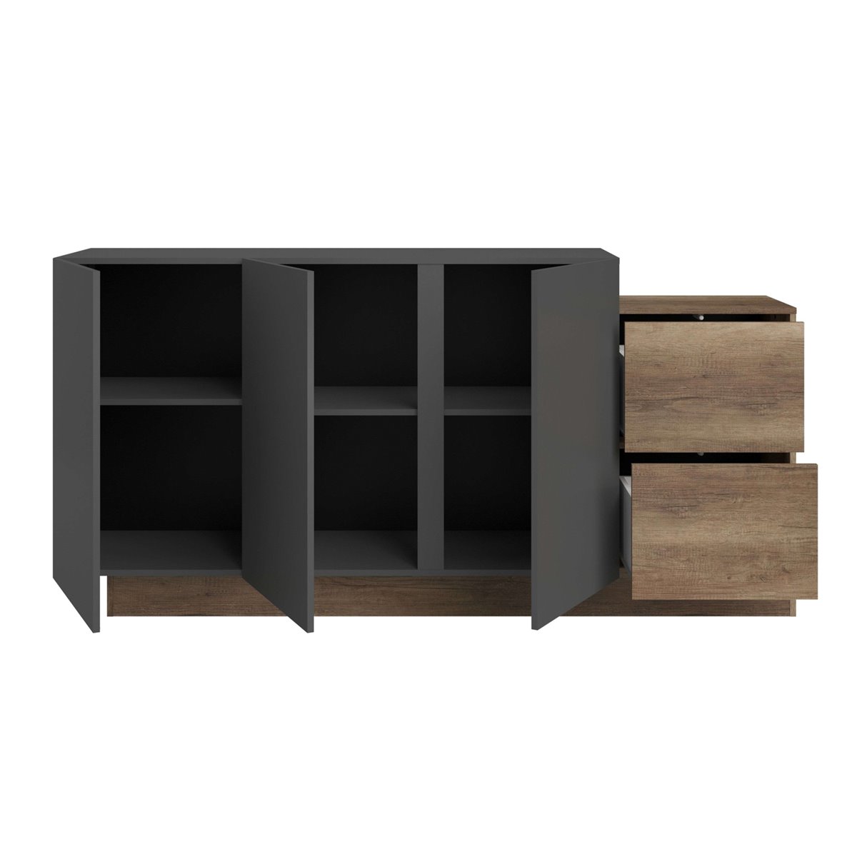 El aparador de salón Opec en gris y roble authe combina de manera efectiva el color frío del gris con el cálido tono roble, generando un impacto visual acogedor y moderno en la sala de estar. Con su estilo contemporáneo, se integra perfectamente en espacios tanto modernos como tradicionales, aportando una sensación de equilibrio y frescura al entorno. Sus líneas limpias y la armonía de sus colores lo convierten en un elemento que enriquece la estética del hogar, ofreciendo un toque actual y agradable al ambiente. Fabricado en melamina, este aparador de salón ofrece mayor resistencia y un acabado atractivo. Está compuesto por 3 puertas que ocultan estantes internos para optimizar el almacenamiento, y 2 cajones ideales para objetos más pequeños. Las dimensiones del mueble aseguran su capacidad para adaptarse a distintos espacios. Mejora tu hogar con este aparador de alta funcionalidad y adquiere una solución de almacenamiento compacta y eficiente hoy mismo. Medidas: Medidas: Ancho: 184 cm, Alto: 88,6 cm, Profundidad: 33 cm. Se trata de mobiliario con kit de montaje, que incluye manual de instrucciones y tornillería.