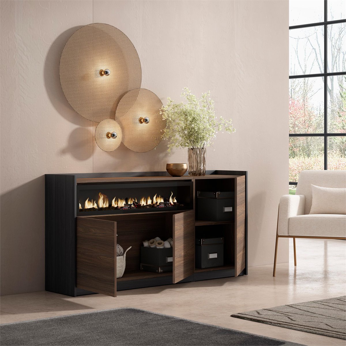Módulo con 2 puertas, gran capacidad de almacenamiento. Medidas del Módulo: 104cm. de Ancho, 80cm. de Alto, 37cm. de Profundidad. Color roble y negro con veteado de madera de tacto poroso de alta calidad. Módulo con puerta y estante interior divisorio. Medidas del Módulo: 52cm. De Ancho, 80cm. De Alto, 37cm. de Profundidad. Color roble y negro con veteado de madera de tacto poroso de alta calidad. Chimenea Eléctrica LED. Medidas: 102cm. de Ancho, 21cm. de Alto. Efecto de fuego 3D increíblemente realista. Sin riesgos de quemaduras ya que no incorpora ninguna fuente de calor. Potencia: 34w. Incluye mando a distancia y 3 niveles de intensidad. La chimenea eléctrica funciona conectada a la electricidad. El mando a distancia requiere pilas, que no están incluidas.