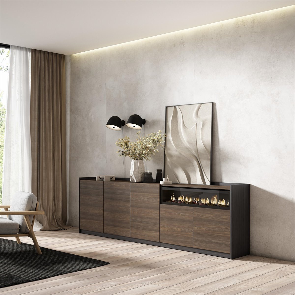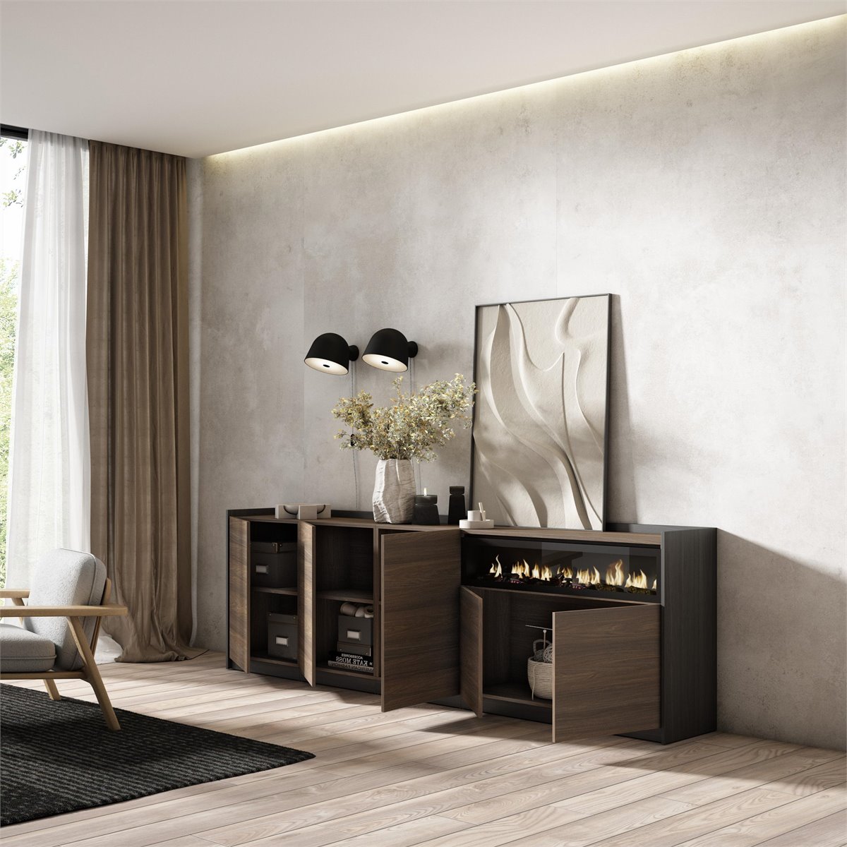 Módulo con 2 puertas, gran capacidad de almacenamiento. Medidas del Módulo: 104cm. de Ancho, 80cm. de Alto, 37cm. de Profundidad. Color roble oscuro y negro con veteado de madera de tacto poroso de alta calidad. Módulo con puerta y estante interior divisorio. Medidas del Módulo: 52cm. De Ancho, 80cm. De Alto, 37cm. de Profundidad. Color roble oscuro y negro con veteado de madera de tacto poroso de alta calidad. Chimenea Eléctrica LED. Medidas: 102cm. de Ancho, 21cm. de Alto. Efecto de fuego 3D increíblemente realista. Sin riesgos de quemaduras ya que no incorpora ninguna fuente de calor. Potencia: 34w. Incluye mando a distancia y 3 niveles de intensidad. La chimenea eléctrica funciona conectada a la electricidad. El mando a distancia requiere pilas, que no están incluidas.