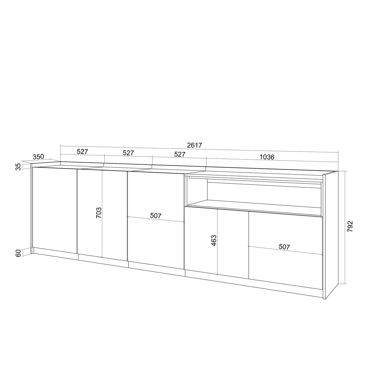Módulo con 2 puertas, gran capacidad de almacenamiento. Medidas del Módulo: 104cm. de Ancho, 80cm. de Alto, 37cm. de Profundidad. Color roble y negro con veteado de madera de tacto poroso de alta calidad.